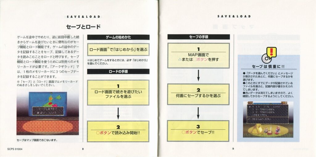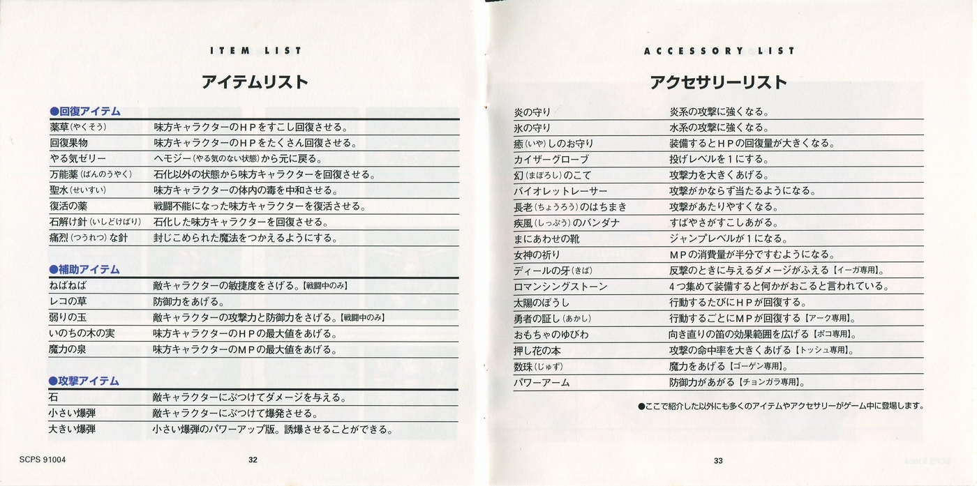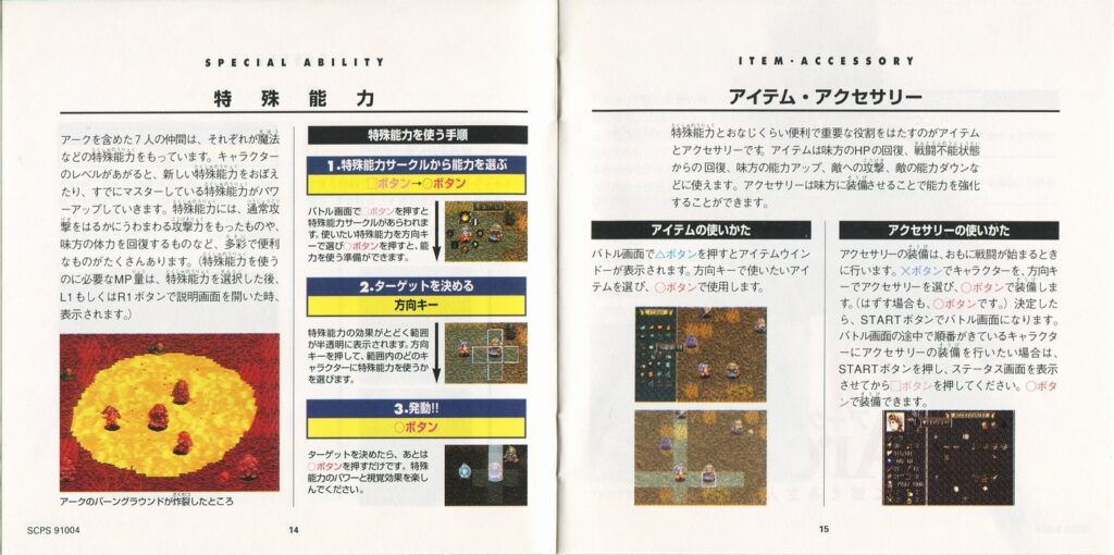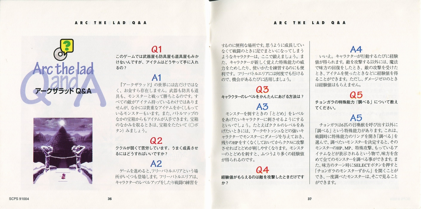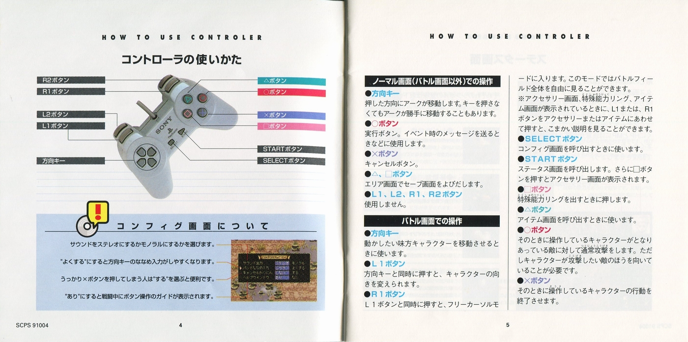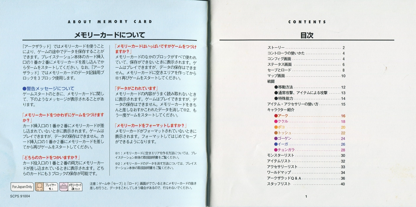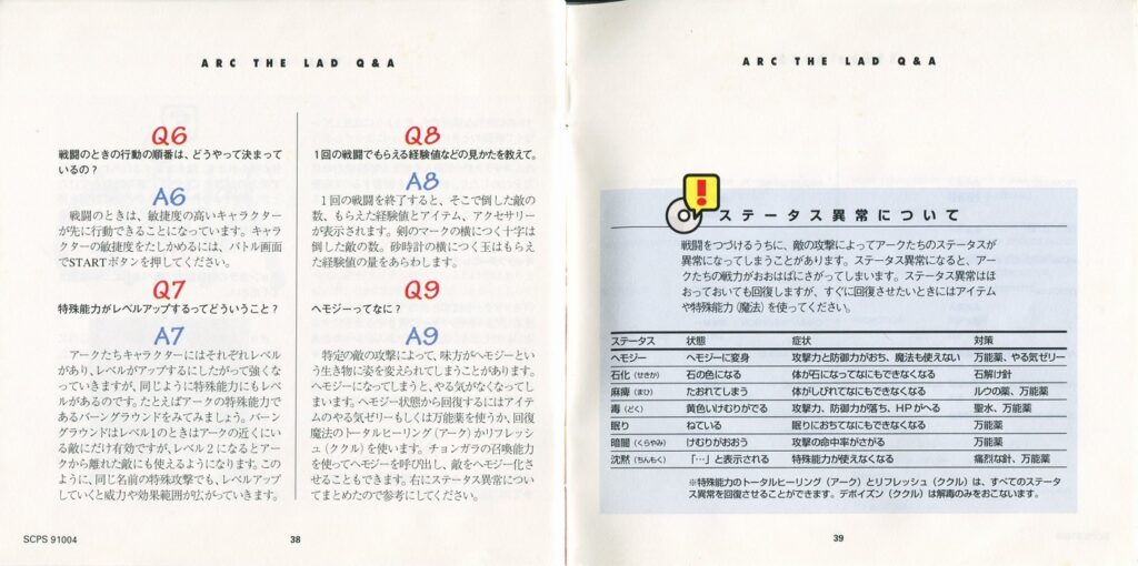 スポンサーリンク アークザラッド 説明書 2025.10.17 プレイステーション(PS1)ソフトアークザラッドの説明書です(Arc The Lad Instruction Manual)※スマホの画像操作は指2本で行ってください。 説明書画像(日本語)