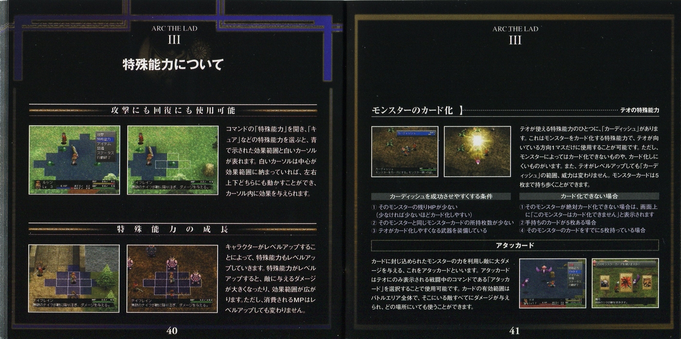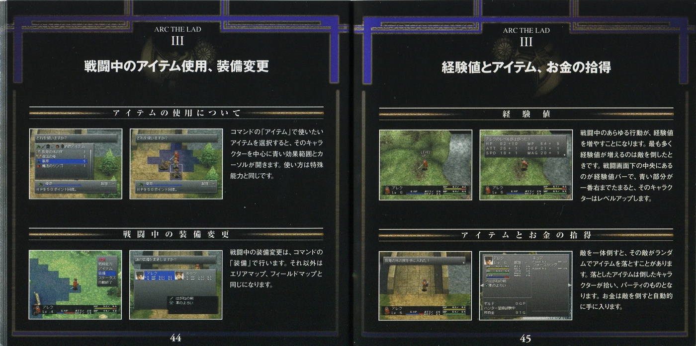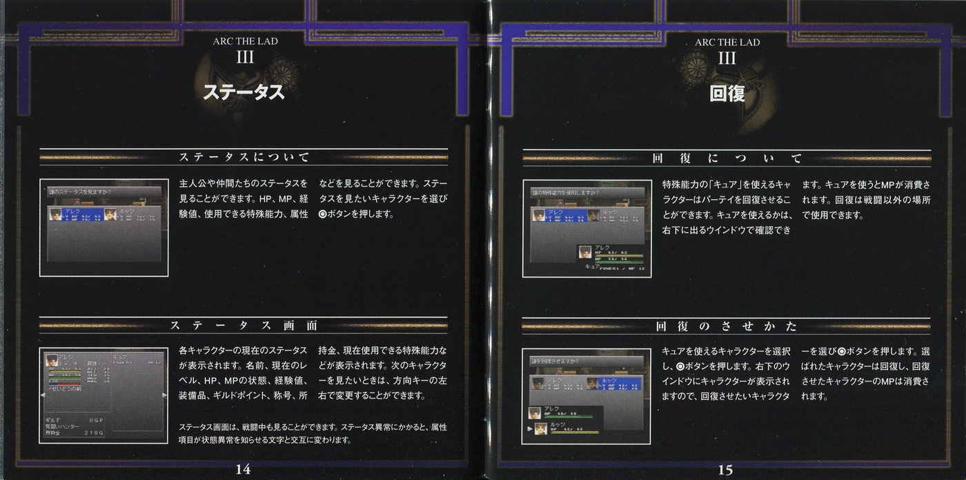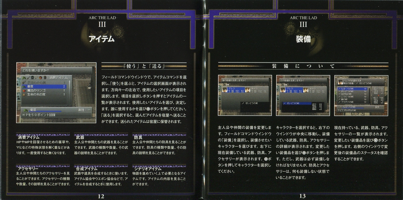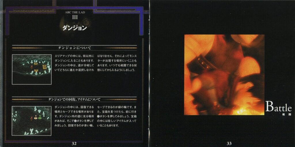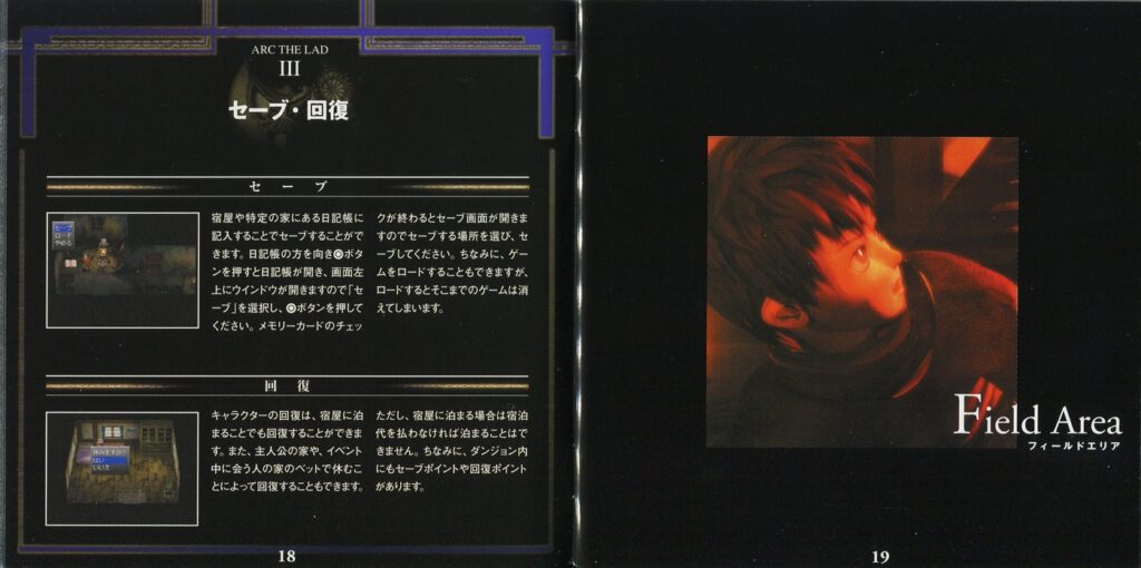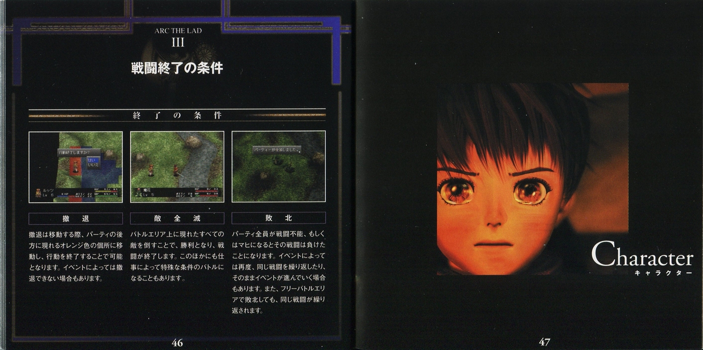 スポンサーリンク アークザラッド3 説明書 2025.11.02 プレイステーション(PS1)ソフトアークザラッド3の説明書です(Arc The Lad3 Instruction Manual)※スマホの画像操作は指2本で行ってください。 目次 説明書画像(日本語)オフィシャルファンクラブ会誌特別号 説明書画像(日本語) オフィシャルファンクラブ会誌特別号