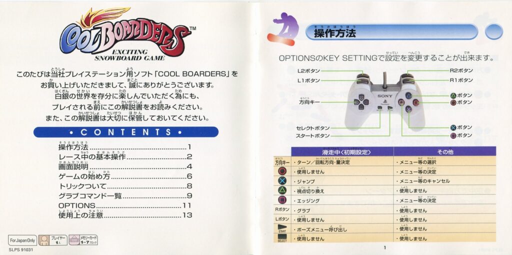 スポンサーリンク クールボーダーズ[PS1] 2026.04.12 プレイステーション(PS1)ソフトクールボーダーズの説明書です(COOL BOARDERS Instruction Manual)※スマホの画像操作は指2本で行ってください。 説明書画像(日本語)