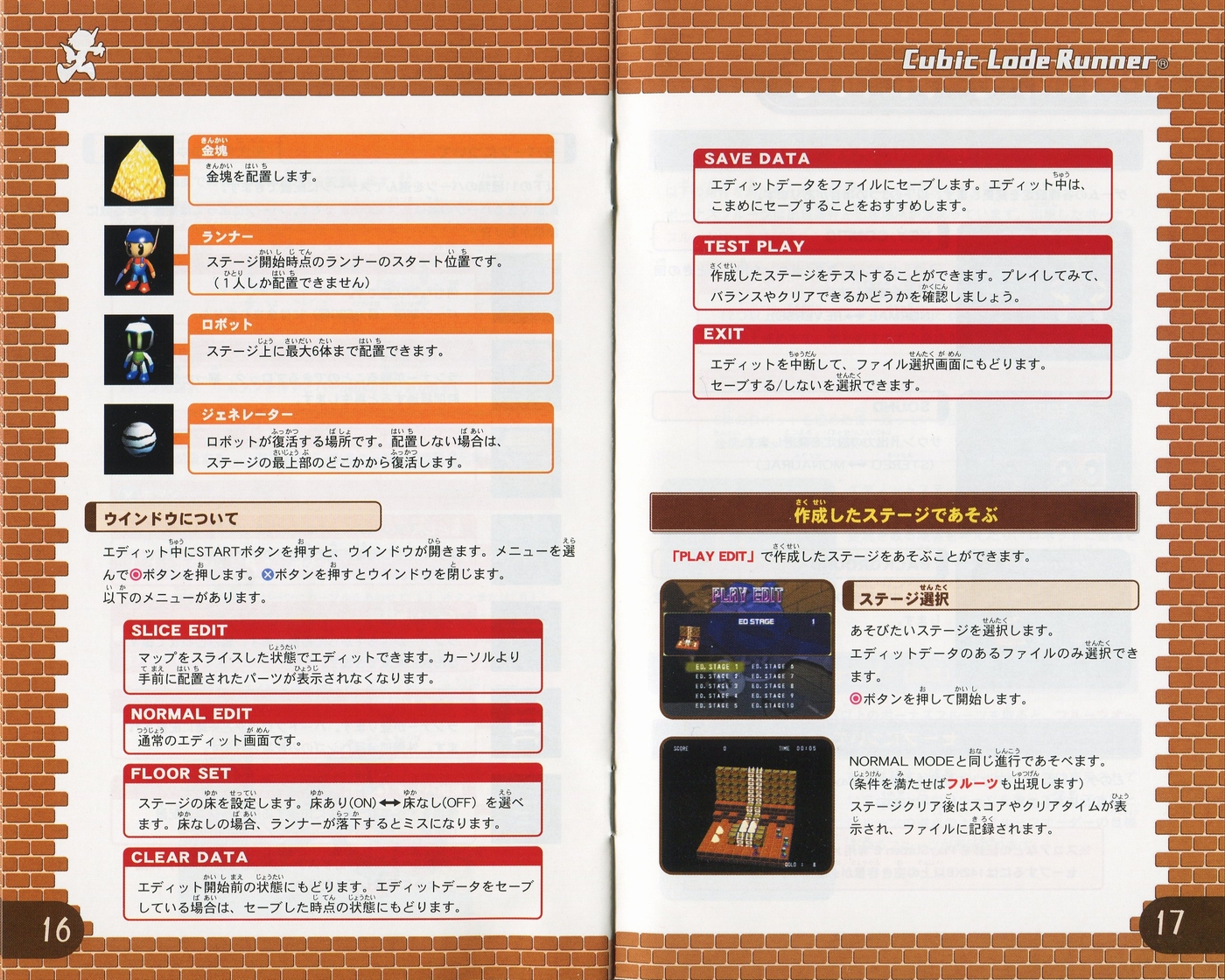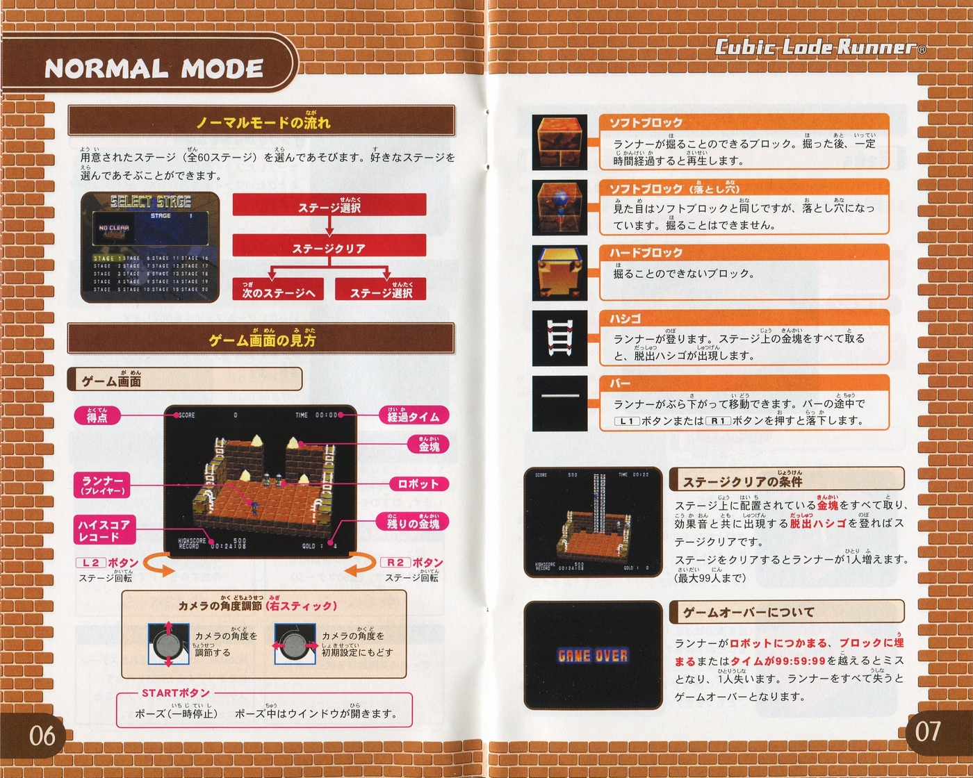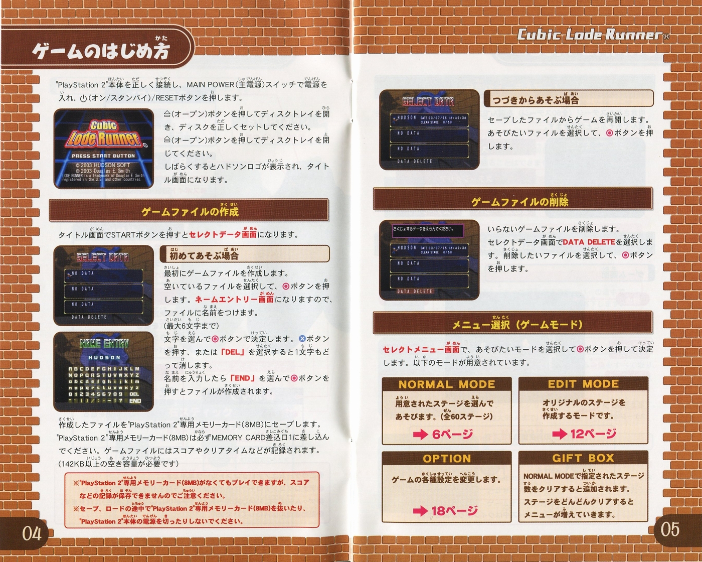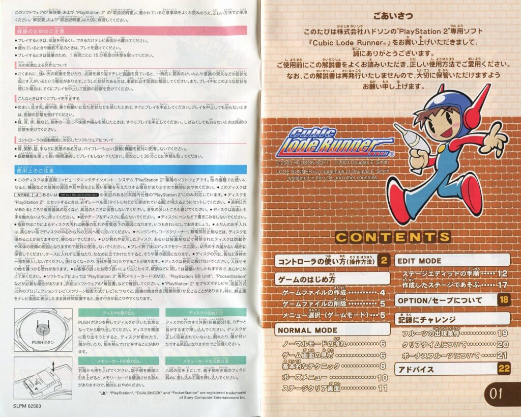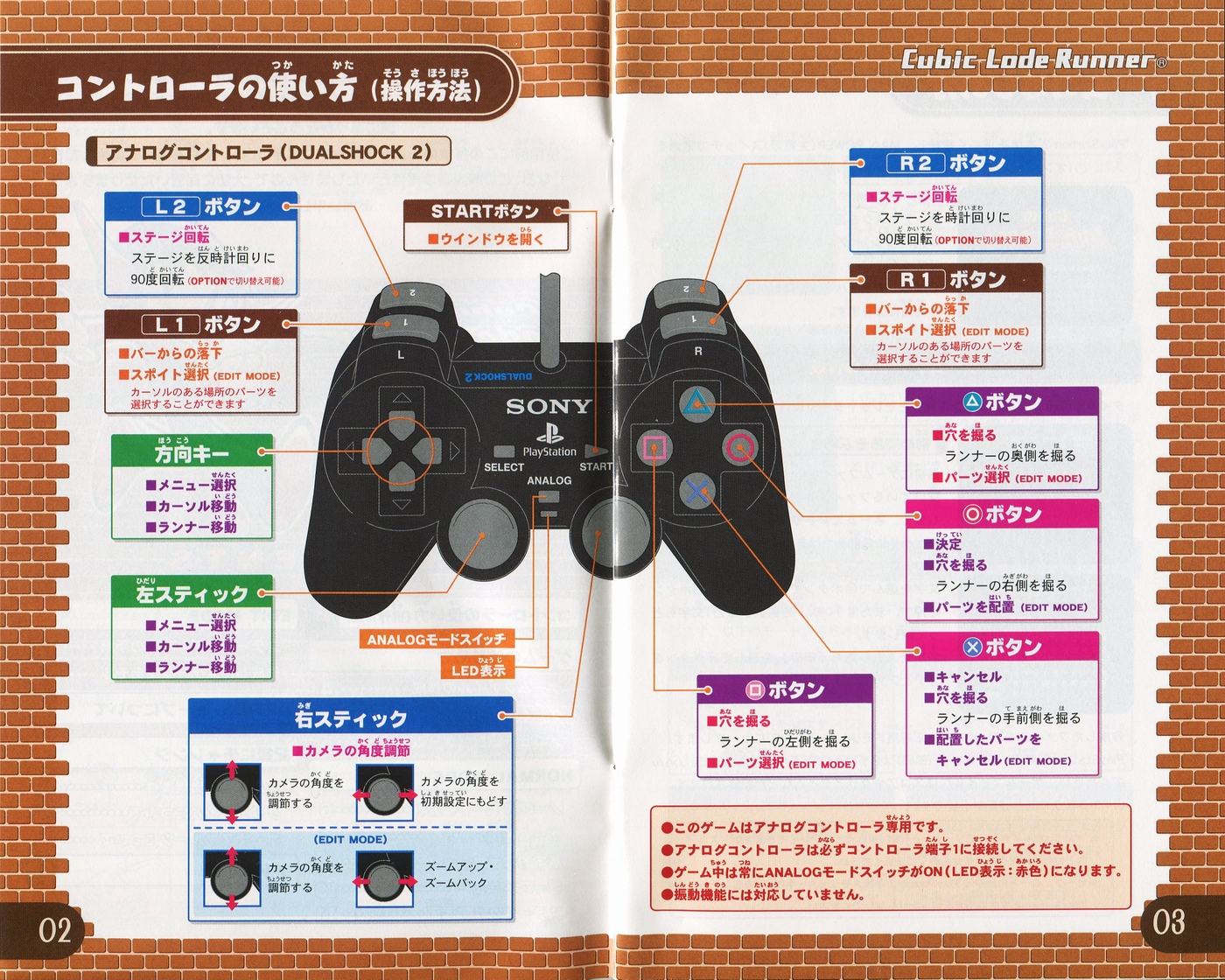 スポンサーリンク キュービックロードランナー[PS2] 2026.04.12 プレイステーション2(PS2)ソフトキュービックロードランナーの説明書です(Cubic Lode Runner Instruction Manual)※スマホの画像操作は指2本で行ってください。 説明書画像(日本語)