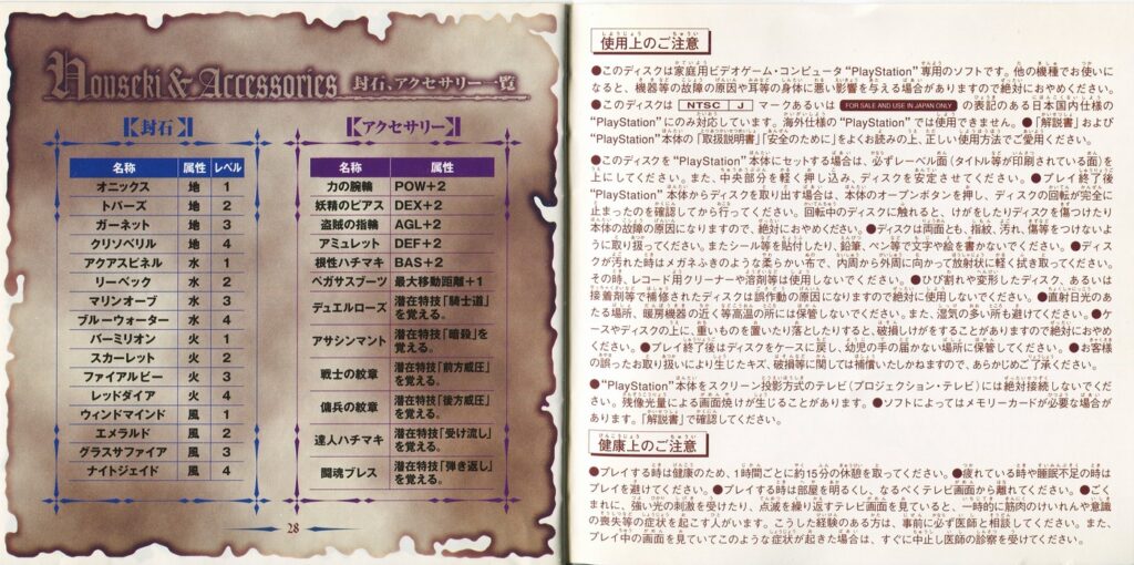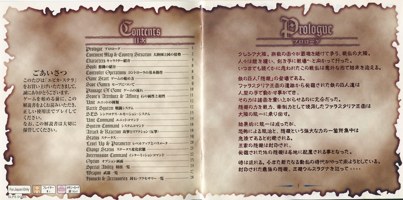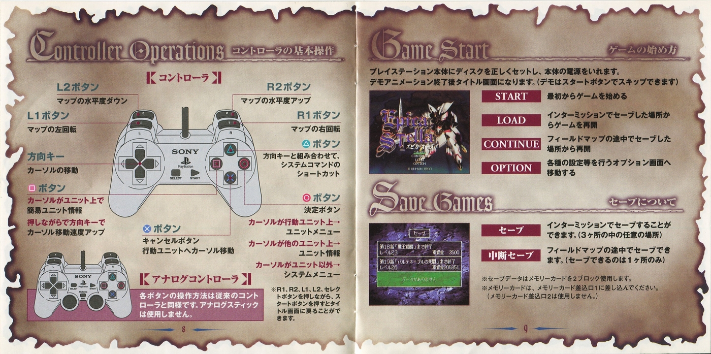 スポンサーリンク エピカ・ステラ[PS1] 2026.03.14 プレイステーション(PS1)ソフトエピカ・ステラの説明書です(Epica Stella Instruction Manual)※スマホの画像操作は指2本で行ってください。 説明書画像(日本語)