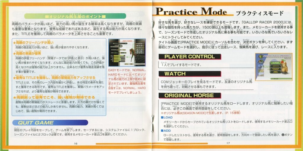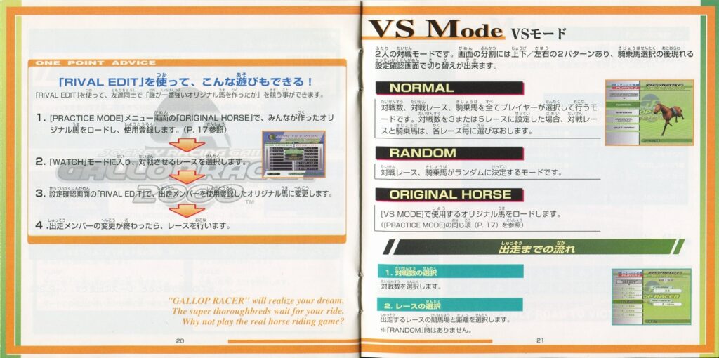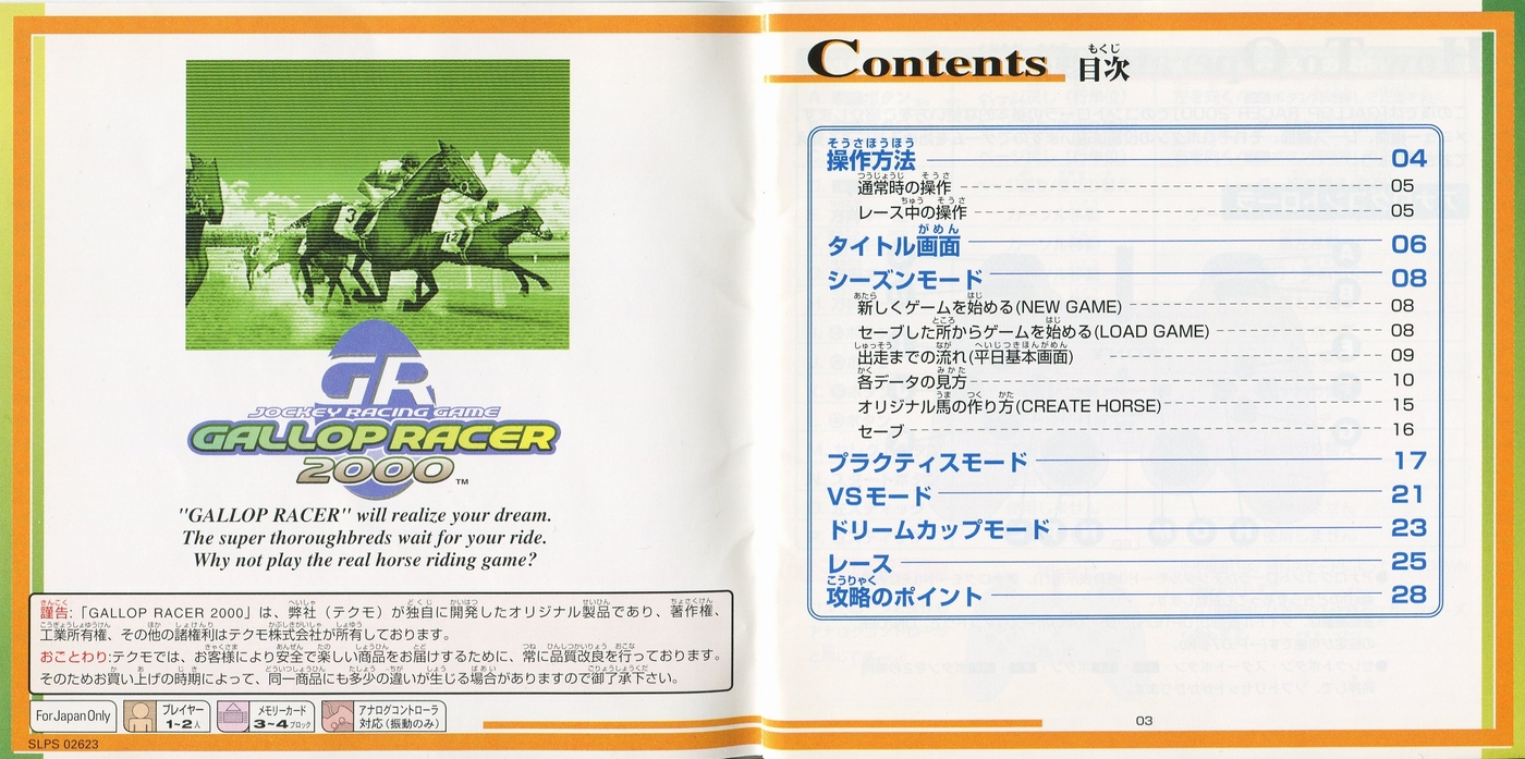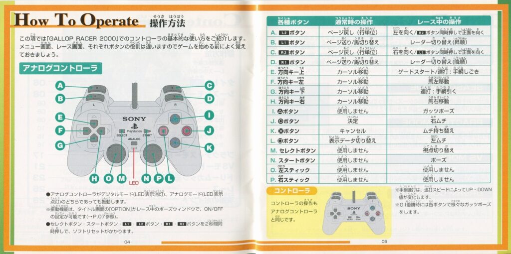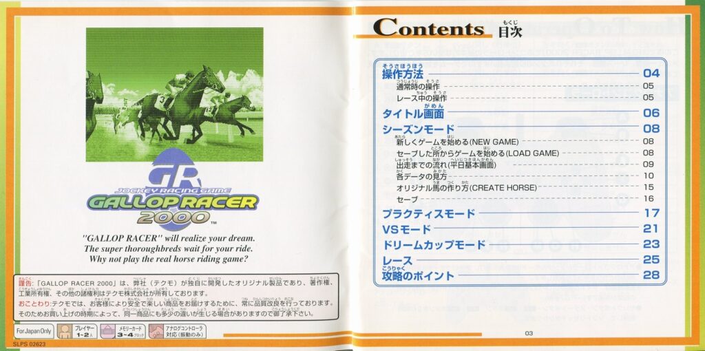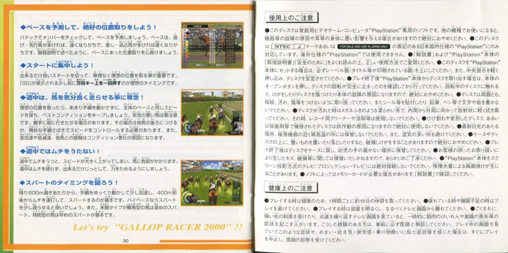 スポンサーリンク ギャロップレーサー2000 説明書 2025.12.14 プレイステーション(PS1)ソフトギャロップレーサー2000の説明書です(Gallop Racer2000 Instruction Manual)※スマホの画像操作は指2本で行ってください。 説明書画像(日本語)