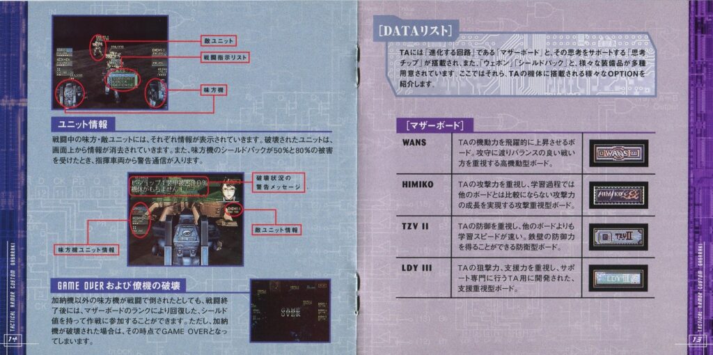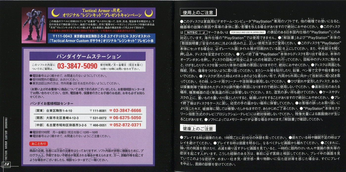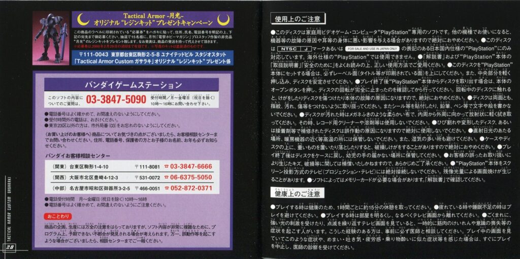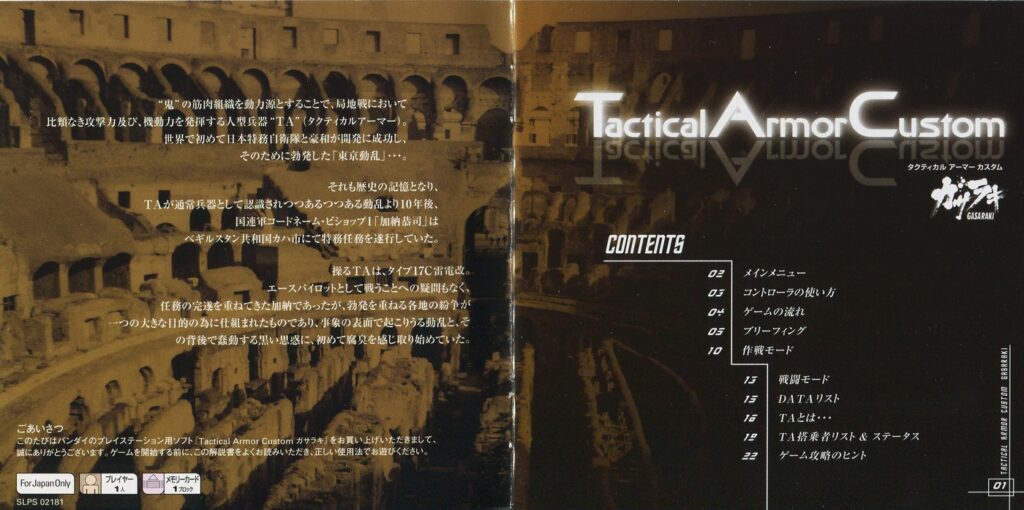 スポンサーリンク タクティカルアーマーカスタム ガサラキ 説明書 2025.10.25 プレイステーション(PS1)ソフトタクティカルアーマーカスタム ガサラキの説明書です(Tactical Armor Custom GASARAKI Instruction Manual)※スマホの画像操作は指2本で行ってください。 説明書画像(日本語)