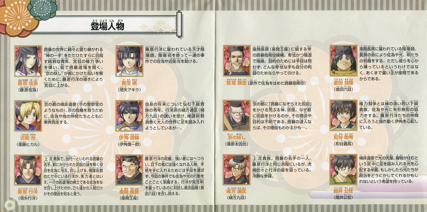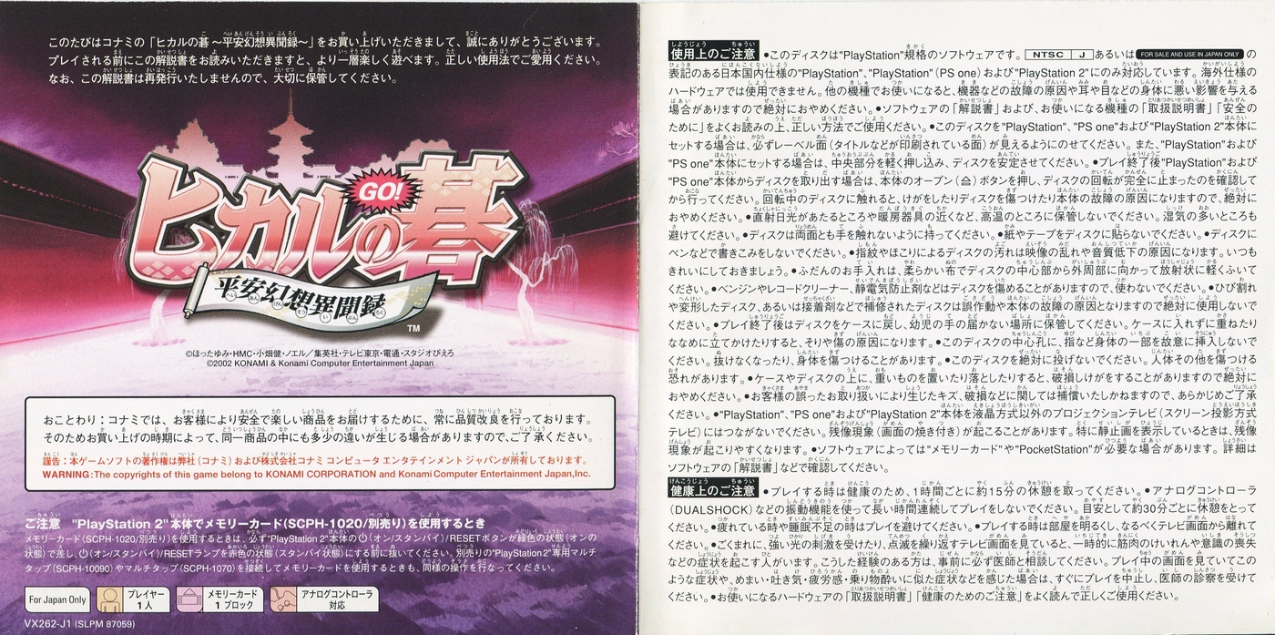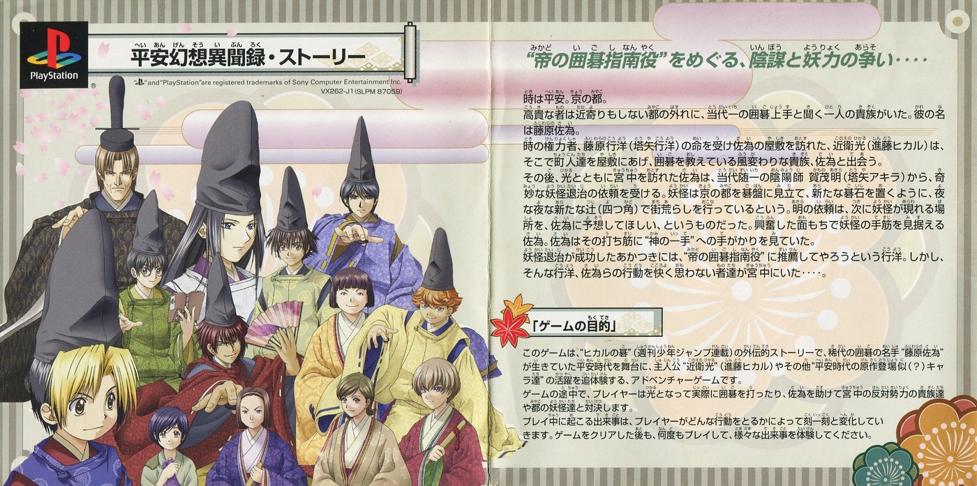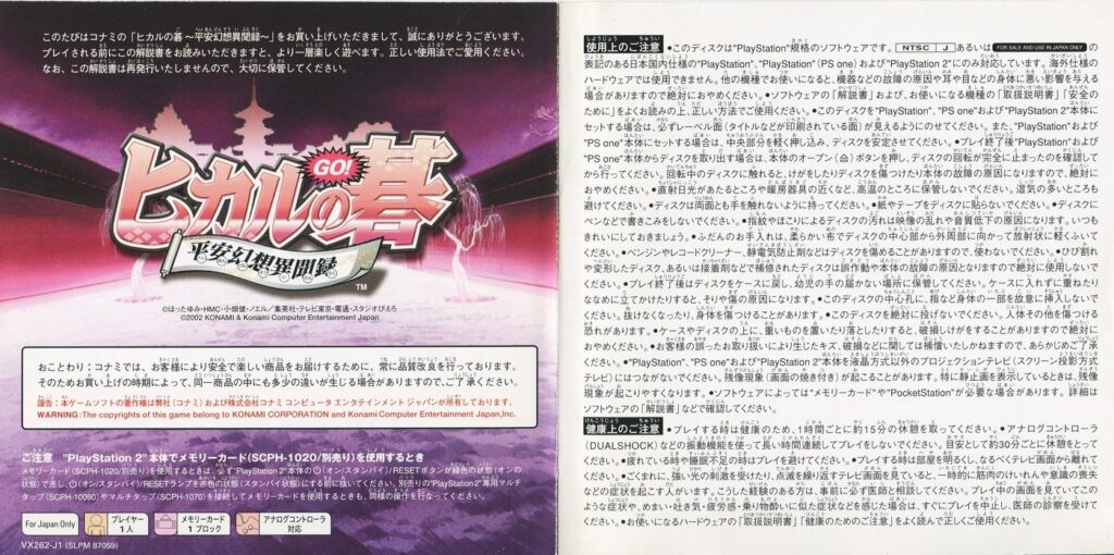 スポンサーリンク ヒカルの碁 ~平安幻想異聞録~ 説明書 2025.12.12 プレイステーション(PS1)ソフトヒカルの碁 ~平安幻想異聞録~の説明書です(Hikaru no go Heian Gensou Ibunroku Instruction Manual)※スマホの画像操作は指2本で行ってください。 説明書画像(日本語)