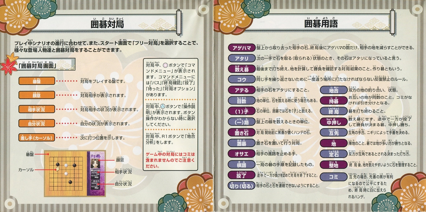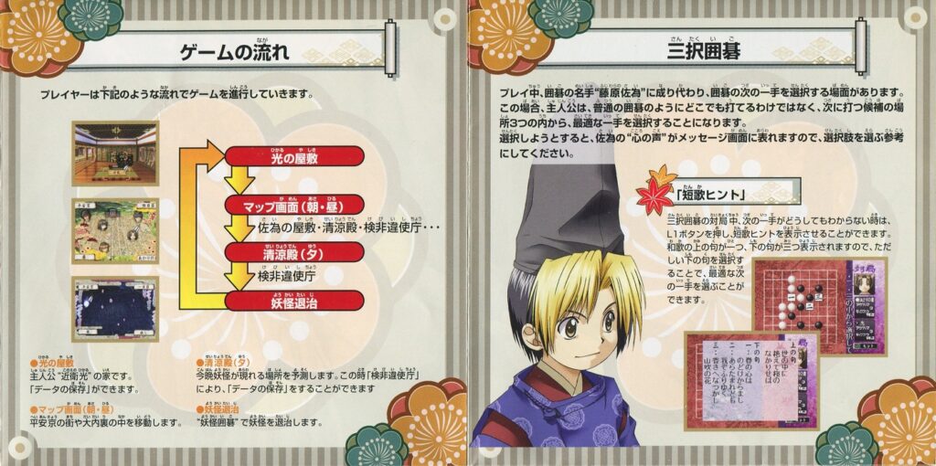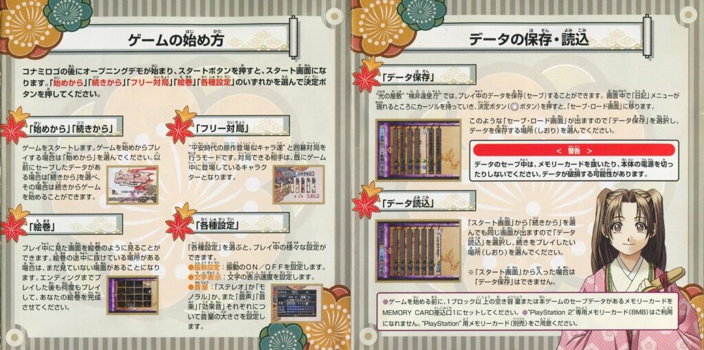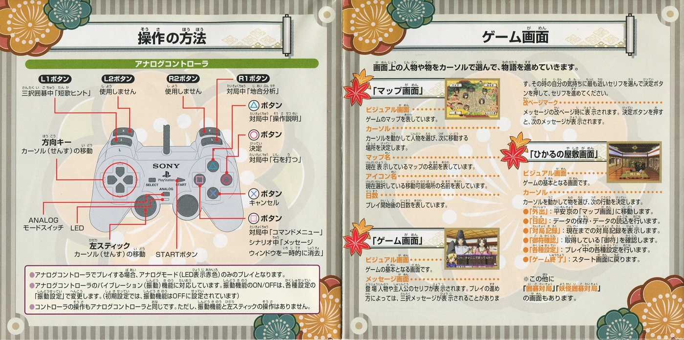 スポンサーリンク ヒカルの碁 ~平安幻想異聞録~ 説明書 2025.12.12 プレイステーション(PS1)ソフトヒカルの碁 ~平安幻想異聞録~の説明書です(Hikaru no go Heian Gensou Ibunroku Instruction Manual)※スマホの画像操作は指2本で行ってください。 説明書画像(日本語)