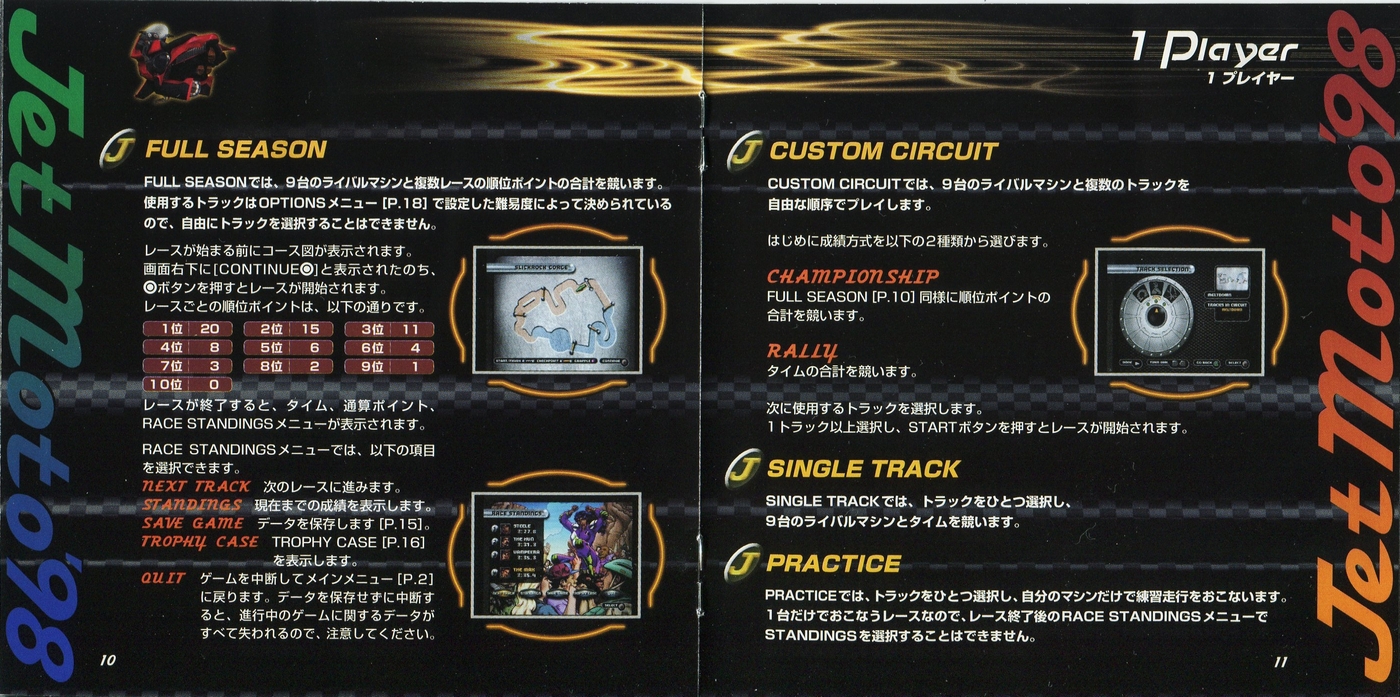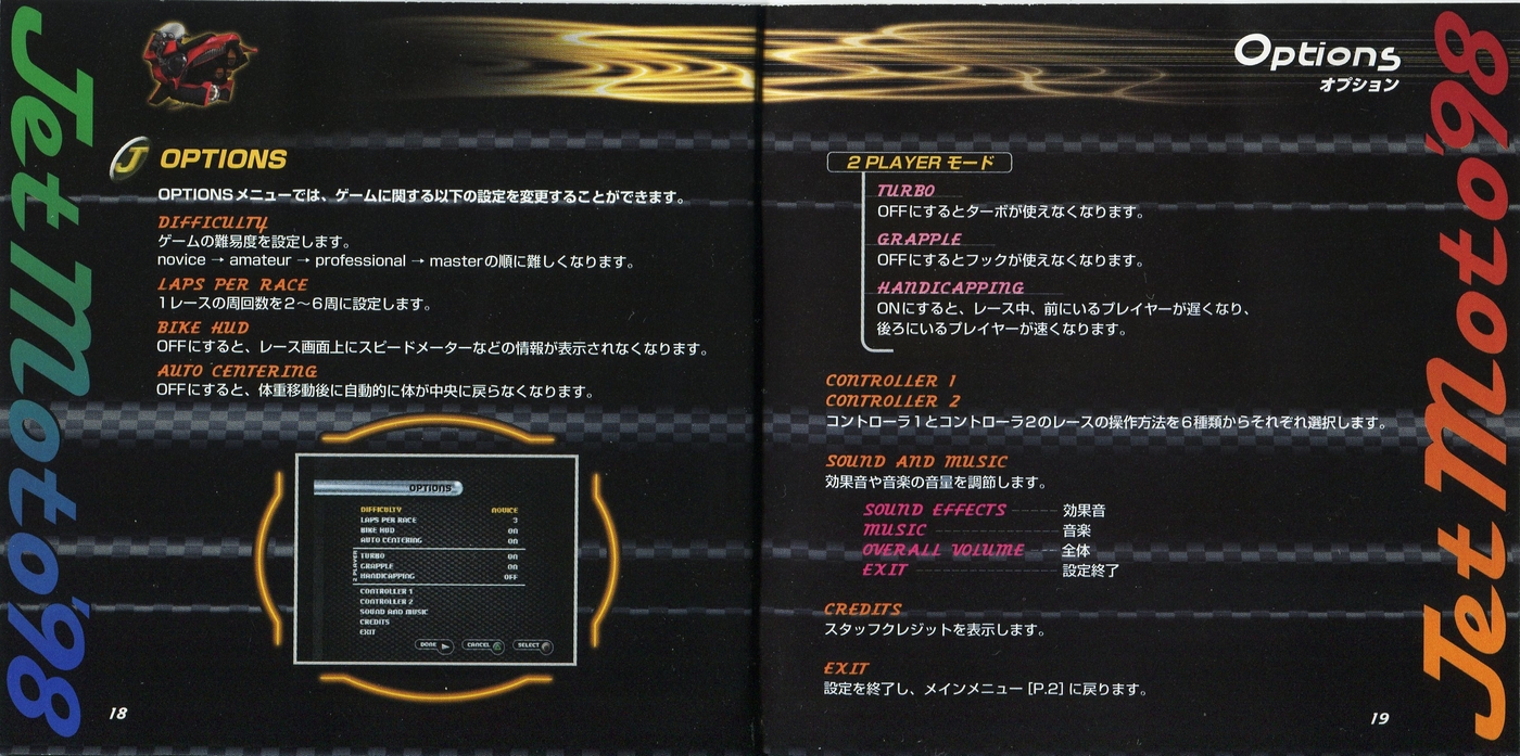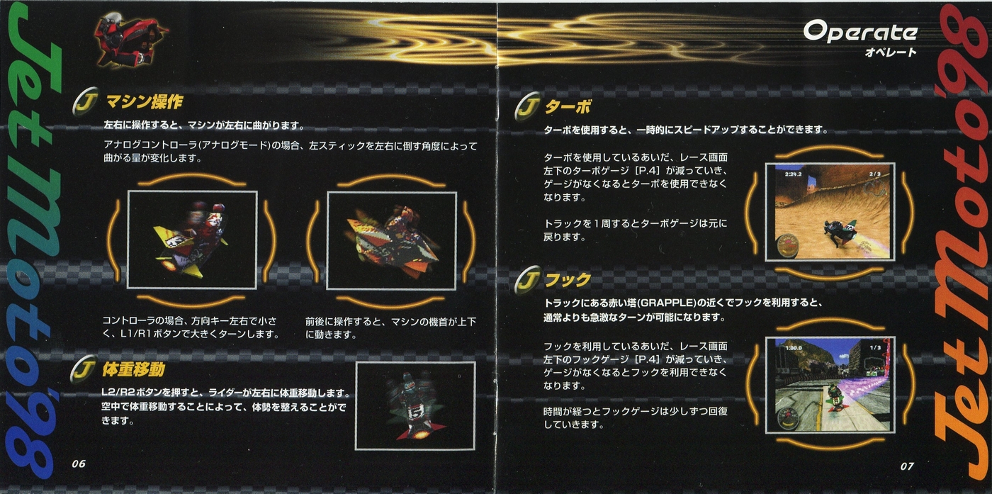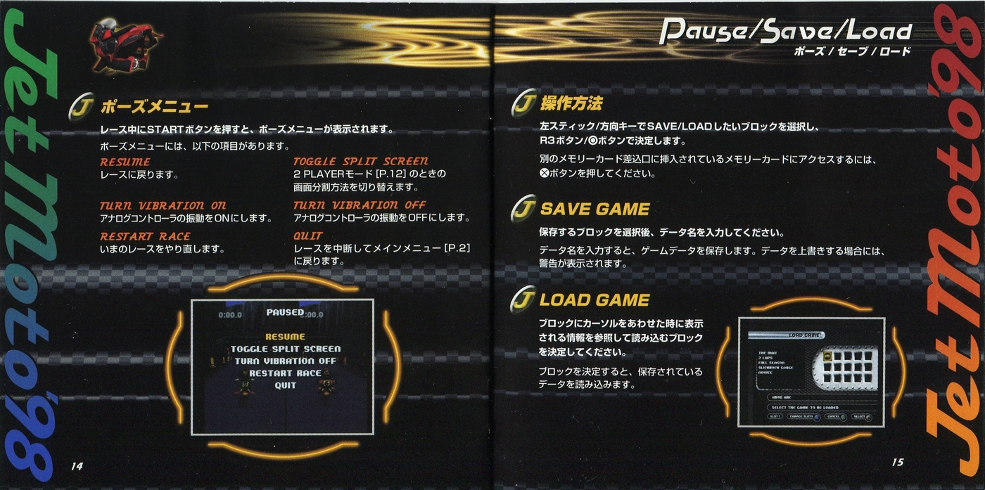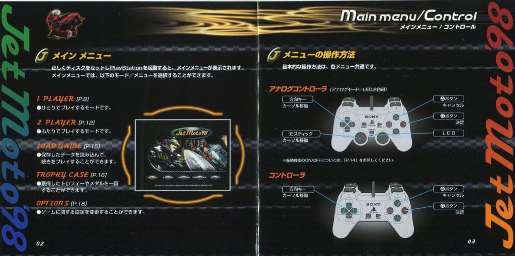 スポンサーリンク ジェットモト’98[PS1] 2026.03.20 プレイステーション(PS1)ソフトジェットモト’98の説明書です(JetMoto’98 Instruction Manual)※スマホの画像操作は指2本で行ってください。 説明書画像(日本語)