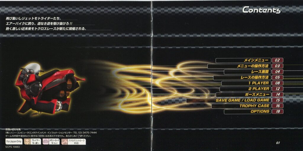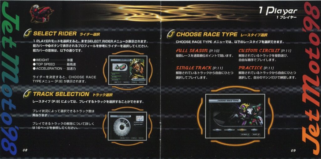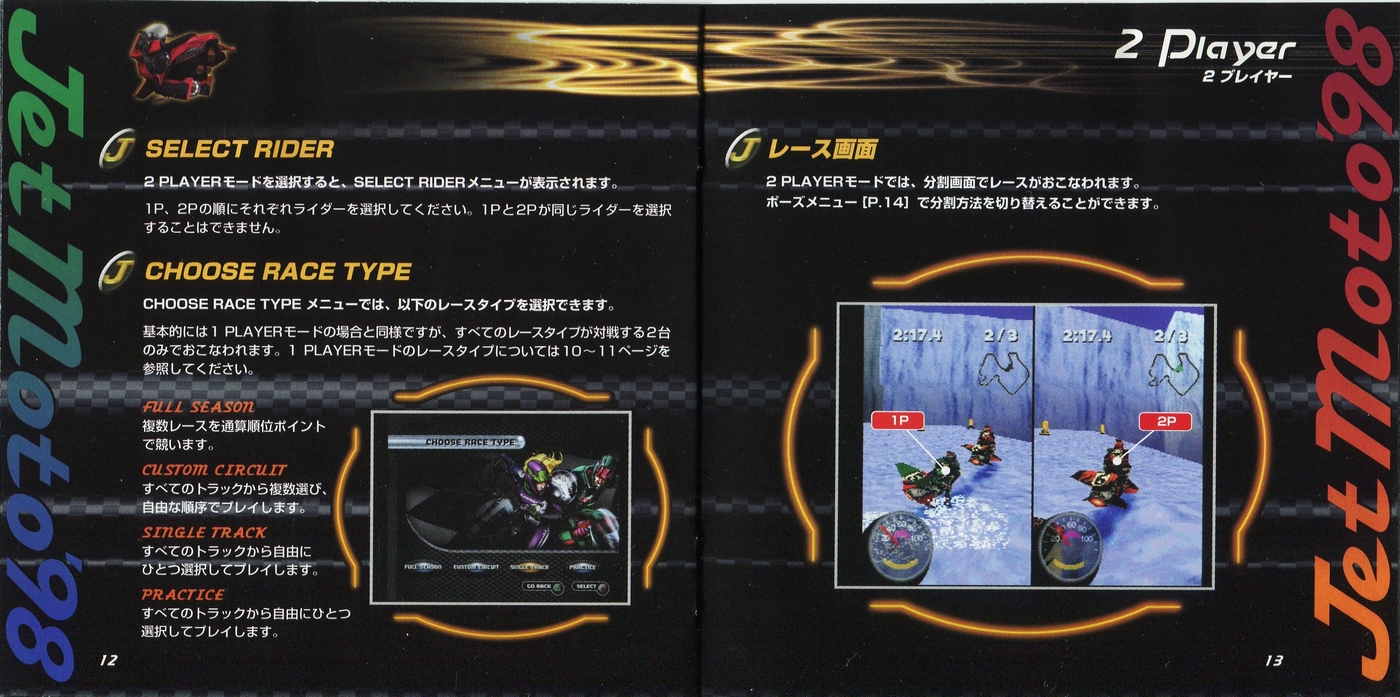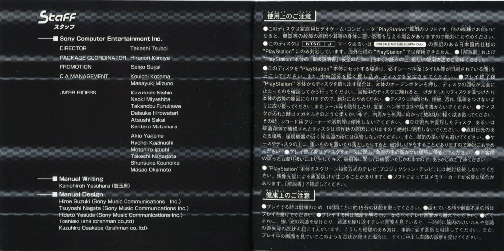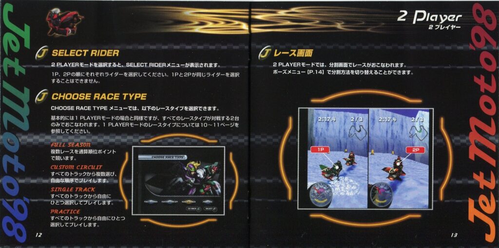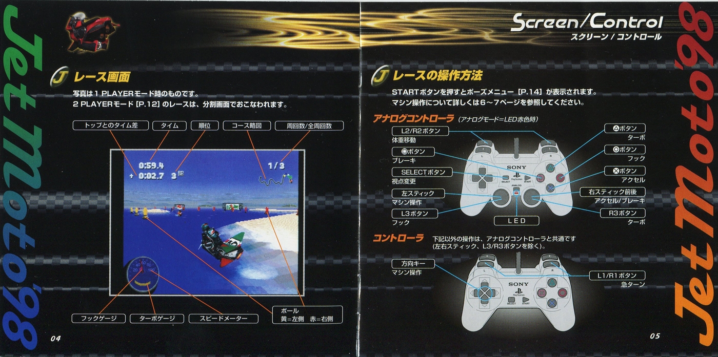 スポンサーリンク ジェットモト’98[PS1] 2026.03.20 プレイステーション(PS1)ソフトジェットモト’98の説明書です(JetMoto’98 Instruction Manual)※スマホの画像操作は指2本で行ってください。 説明書画像(日本語)