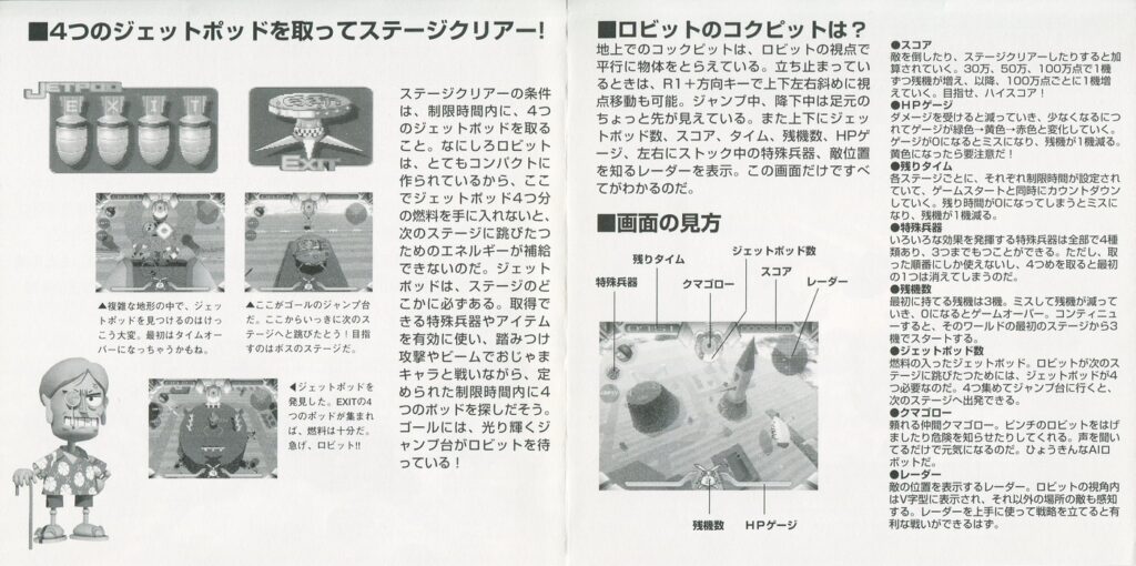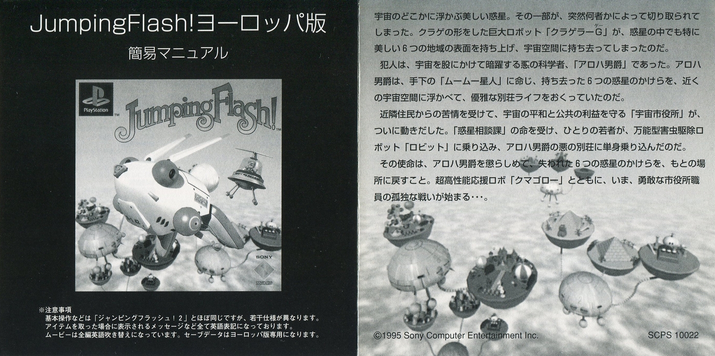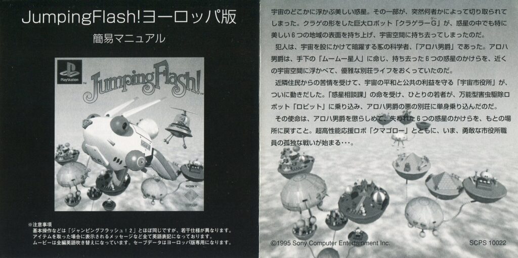 スポンサーリンク ジャンピングフラッシュ!2 説明書 2025.09.062025.10.25 プレイステーション(PS1)ソフトジャンピングフラッシュ!2 アロハ男爵大弱りの巻の説明書です(JumpingFlash!2 Instruction Manual)※スマホの画像操作は指2本で行ってください。 目次 説明書画像(日本語)JumpingFlash!ヨーロッパ版 簡易マニュアル 説明書画像(日本語) JumpingFlash!ヨーロッパ版 簡易マニュアル