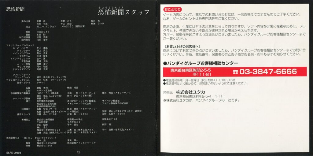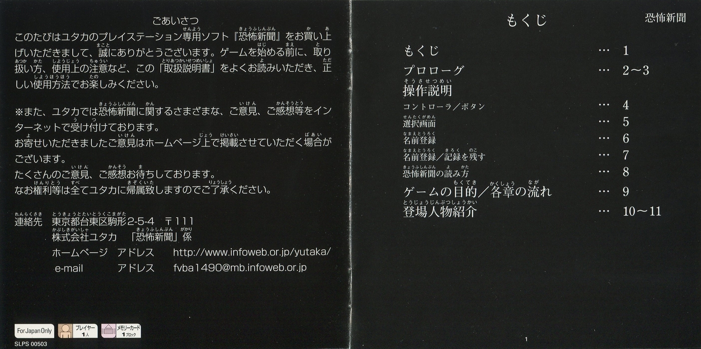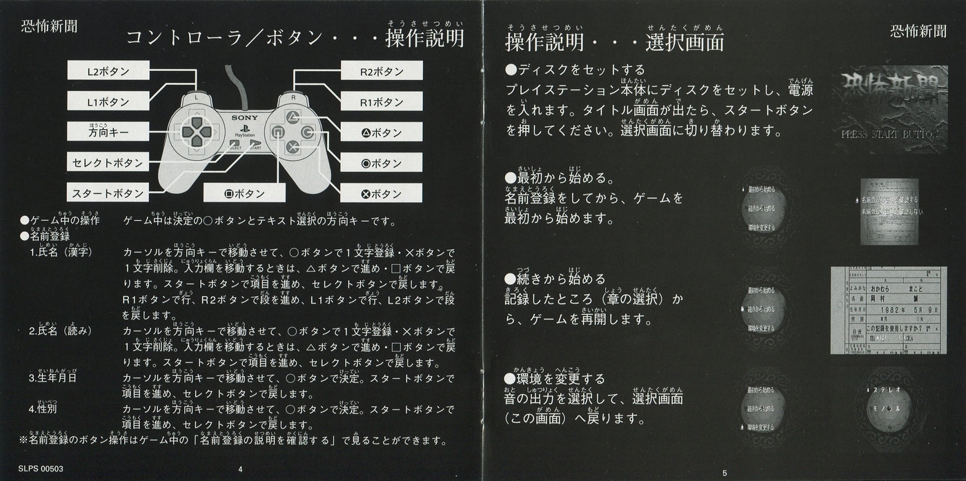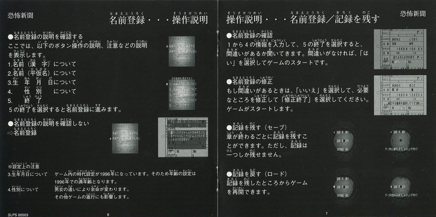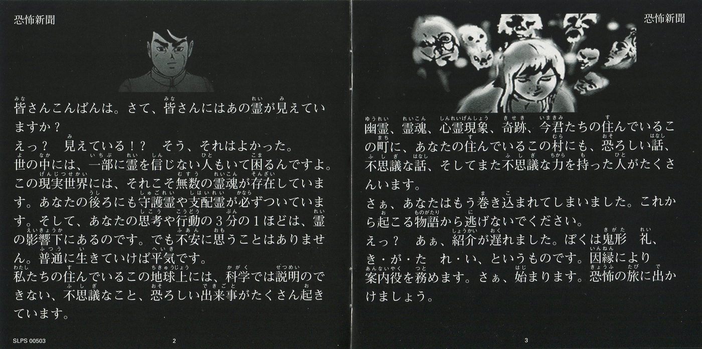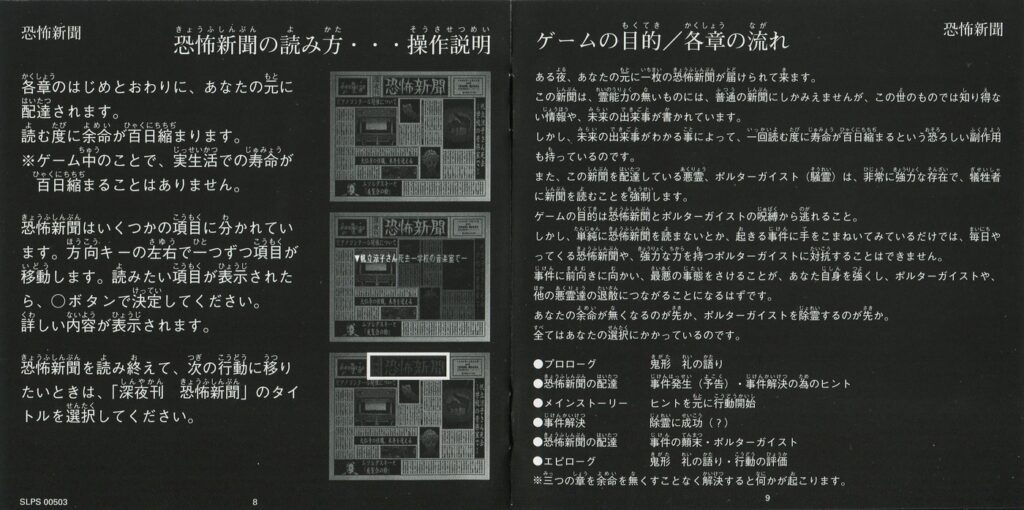 スポンサーリンク 恐怖新聞[PS1] 2026.01.21 プレイステーション(PS1)ソフト恐怖新聞の説明書です(Kyoufu Shinbun Instruction Manual)※スマホの画像操作は指2本で行ってください。 説明書画像(日本語)