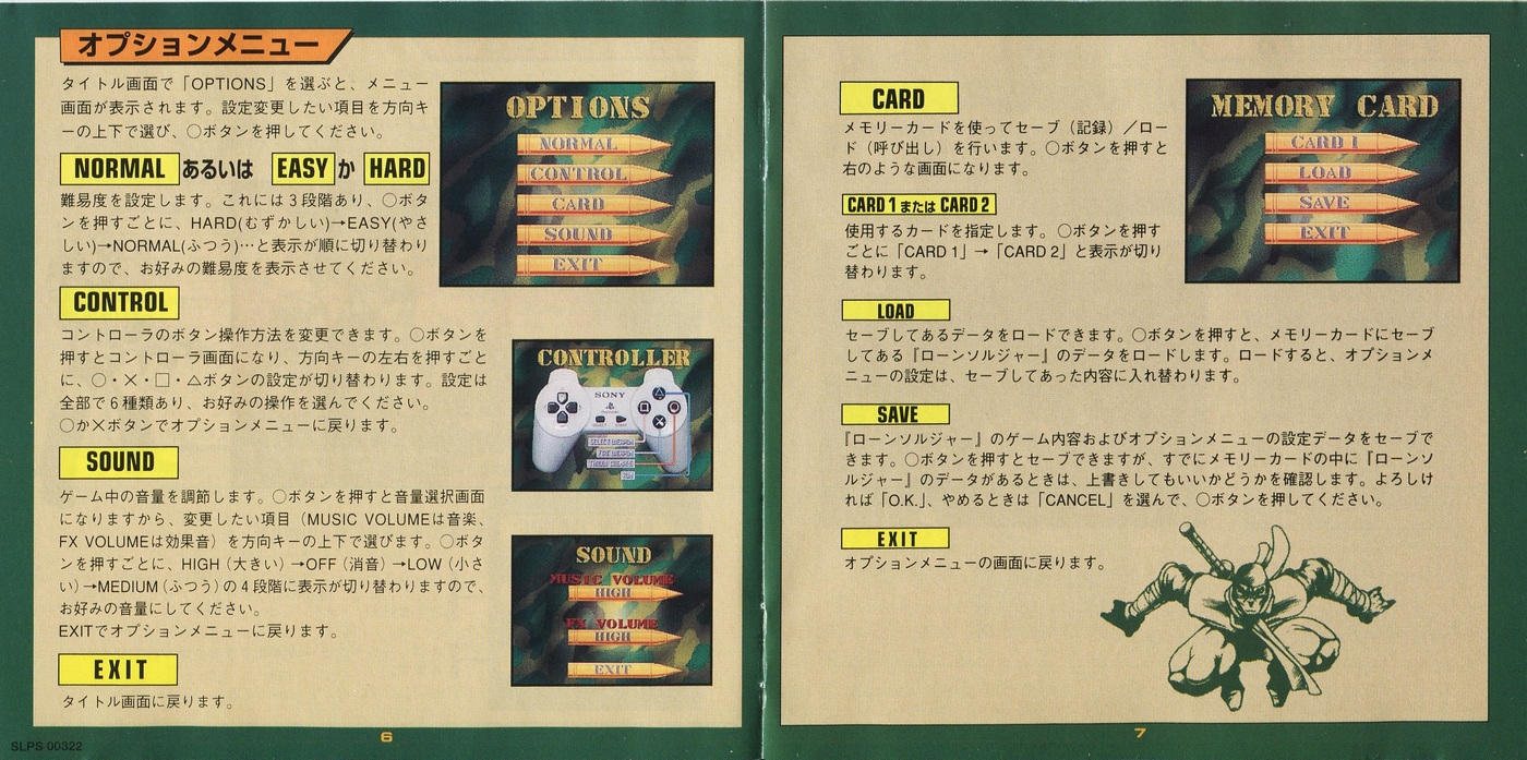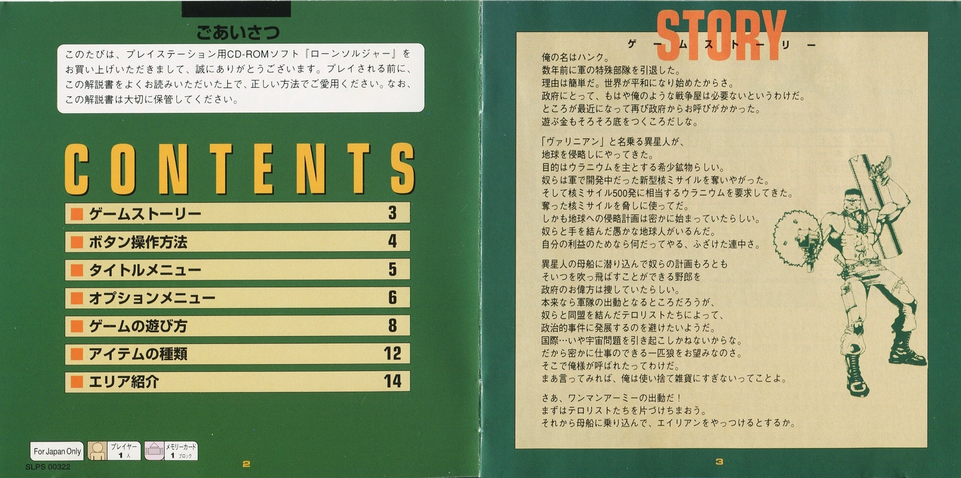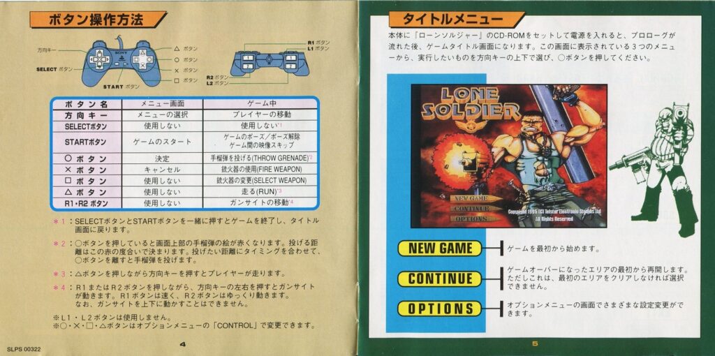 スポンサーリンク ローンソルジャー 説明書 2025.09.29 プレイステーション(PS1)ソフトローンソルジャーの説明書です(Lone Soldier Instruction Manual)※スマホの画像操作は指2本で行ってください。 説明書画像(日本語)