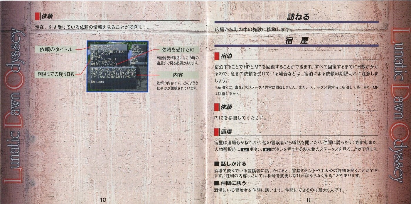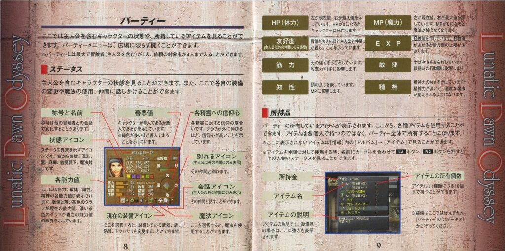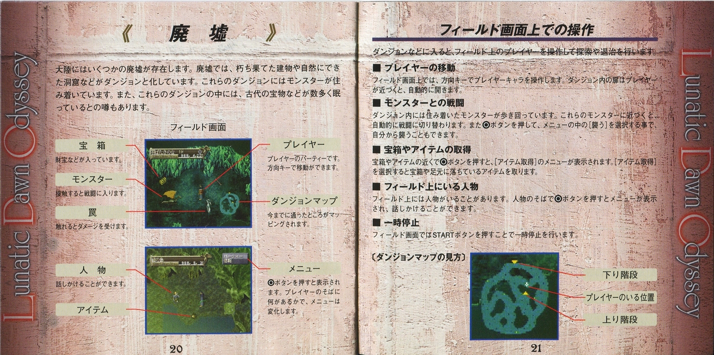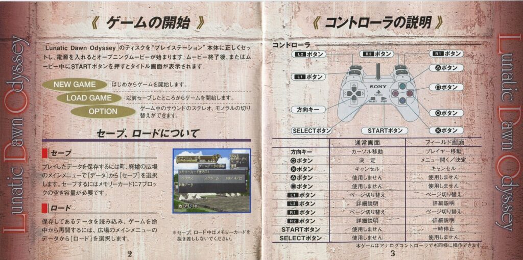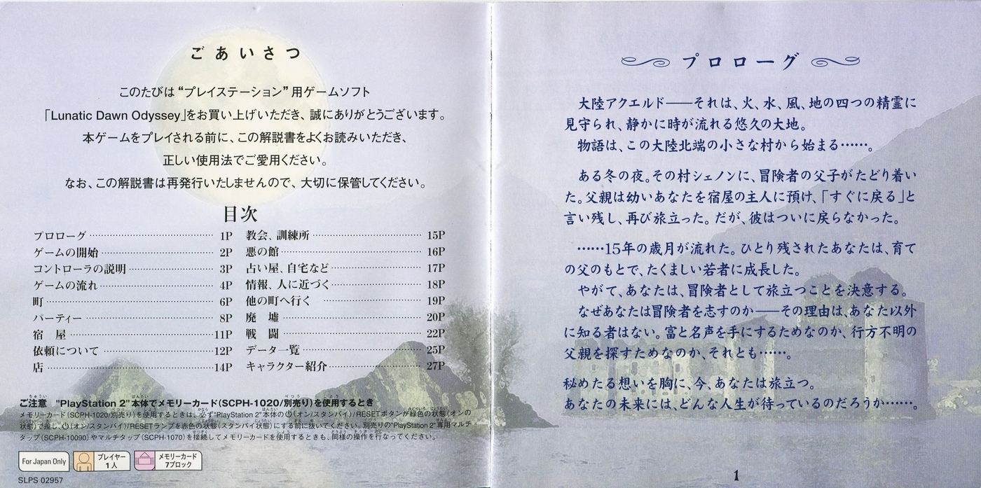 スポンサーリンク ルナティックドーン オデッセイ[PS1] 2026.01.09 プレイステーション(PS1)ソフトルナティックドーン オデッセイの説明書です(Lunatic Dawn Odyssey Instruction Manual)※スマホの画像操作は指2本で行ってください。 説明書画像(日本語)