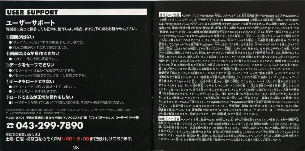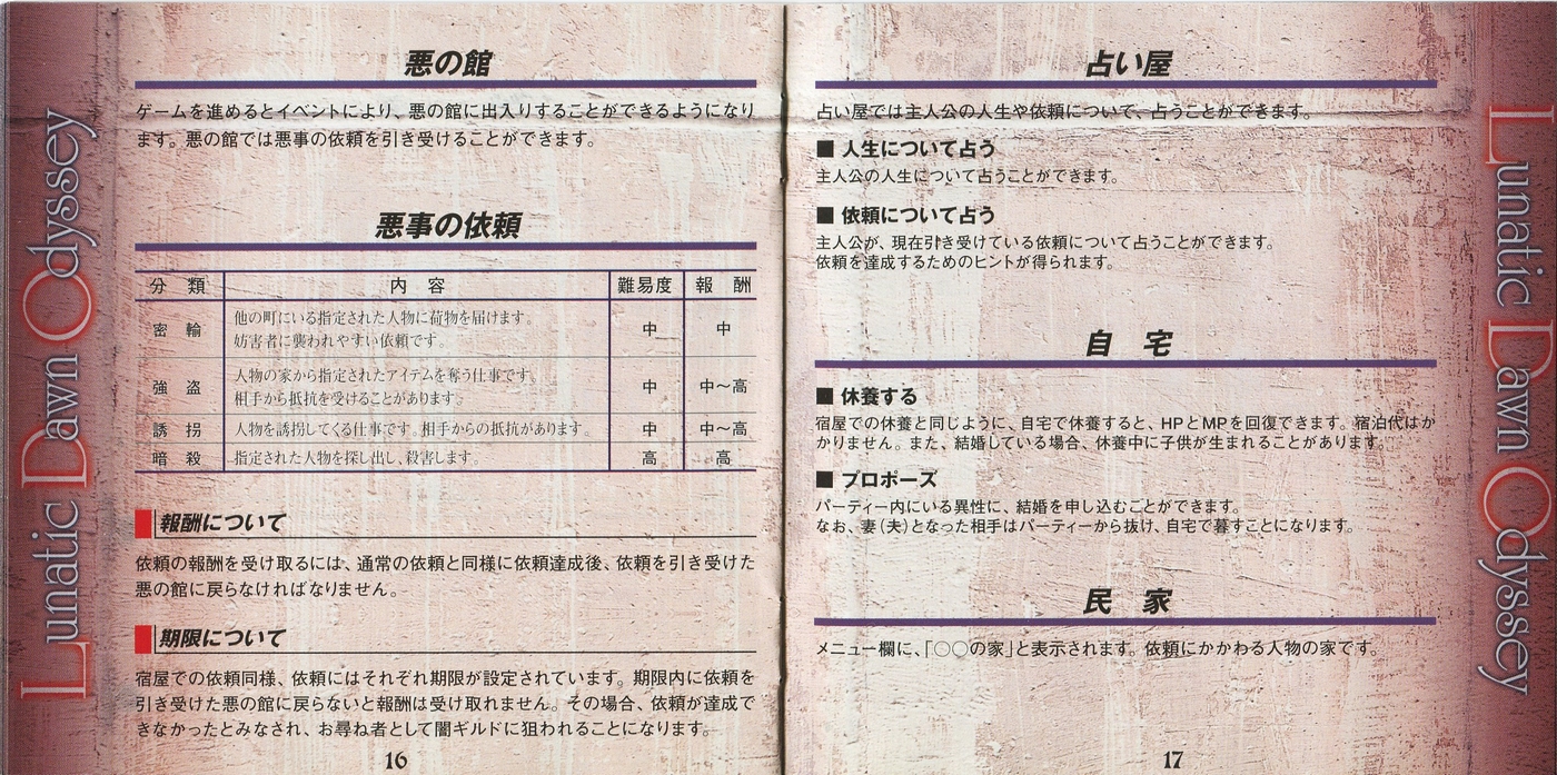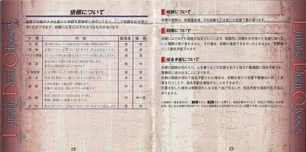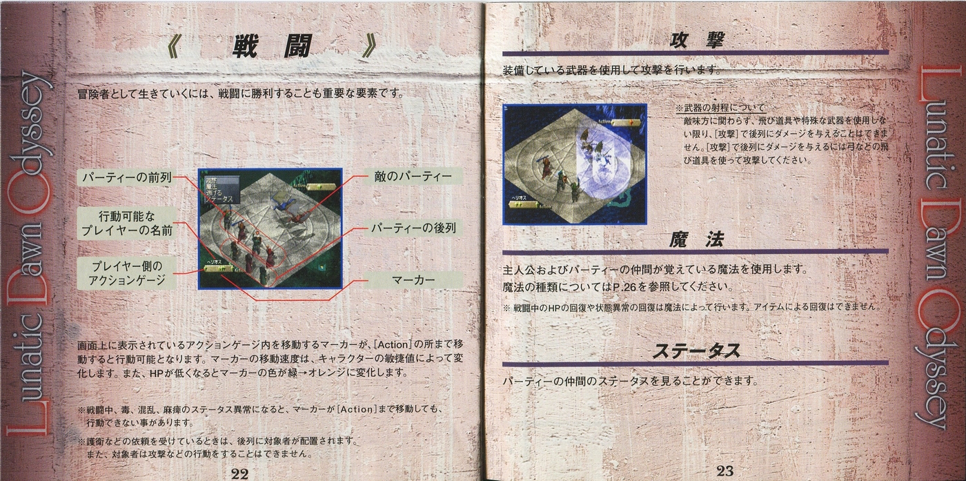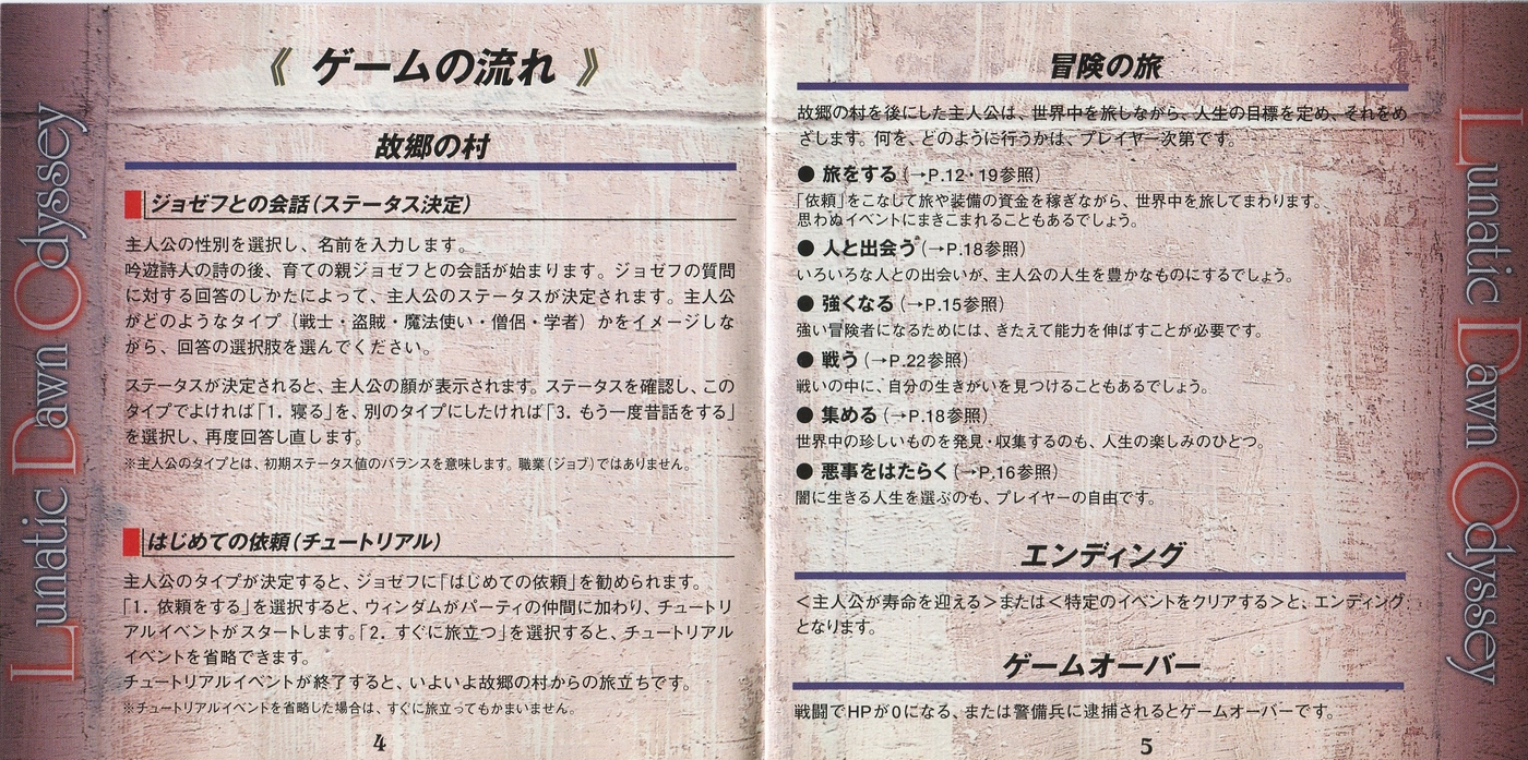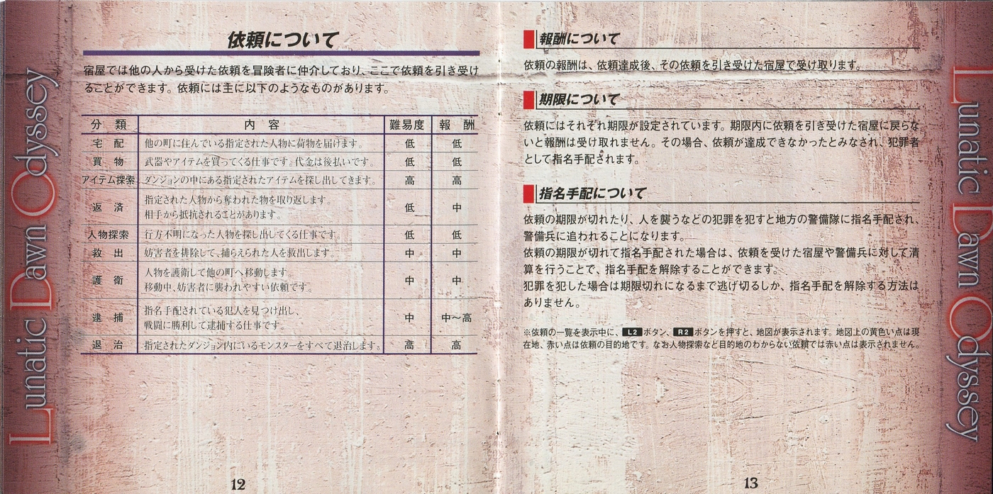 スポンサーリンク ルナティックドーン オデッセイ[PS1] 2026.01.09 プレイステーション(PS1)ソフトルナティックドーン オデッセイの説明書です(Lunatic Dawn Odyssey Instruction Manual)※スマホの画像操作は指2本で行ってください。 説明書画像(日本語)