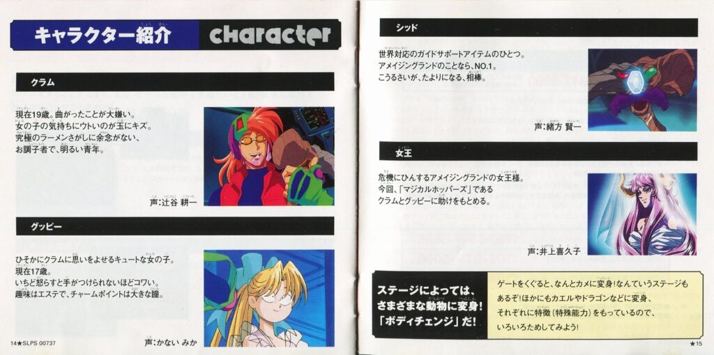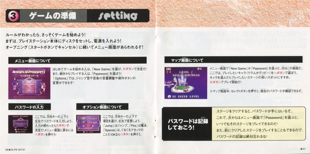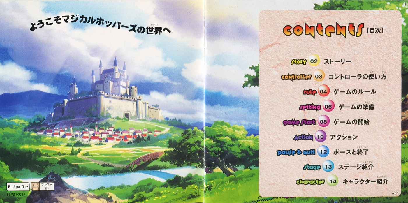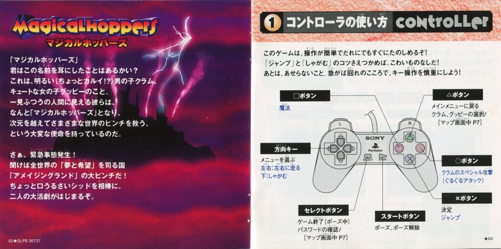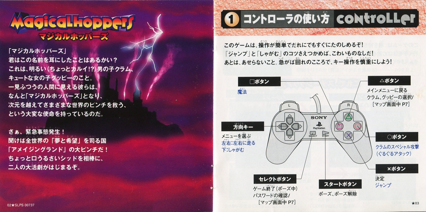 スポンサーリンク マジカルホッパーズ 説明書 2025.09.28 プレイステーション(PS1)ソフトマジカルホッパーズの説明書です(MAGICAL HOPPERS Instruction Manual)※スマホの画像操作は指2本で行ってください。 説明書画像(日本語)
