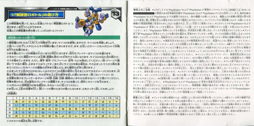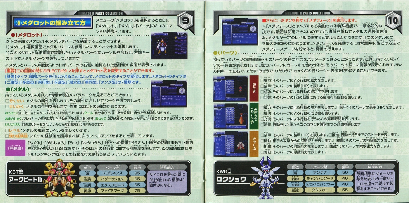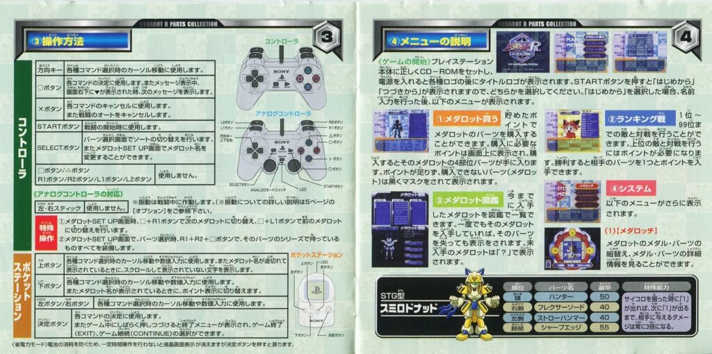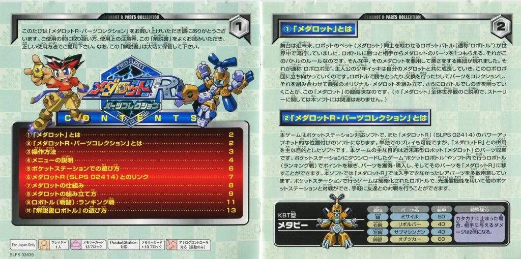 スポンサーリンク メダロットR パーツコレクション 説明書 2025.12.22 プレイステーション(PS1)ソフトメダロットR パーツコレクションの説明書です(Medarot R Parts Collection Instruction Manual)※スマホの画像操作は指2本で行ってください。 説明書画像(日本語)