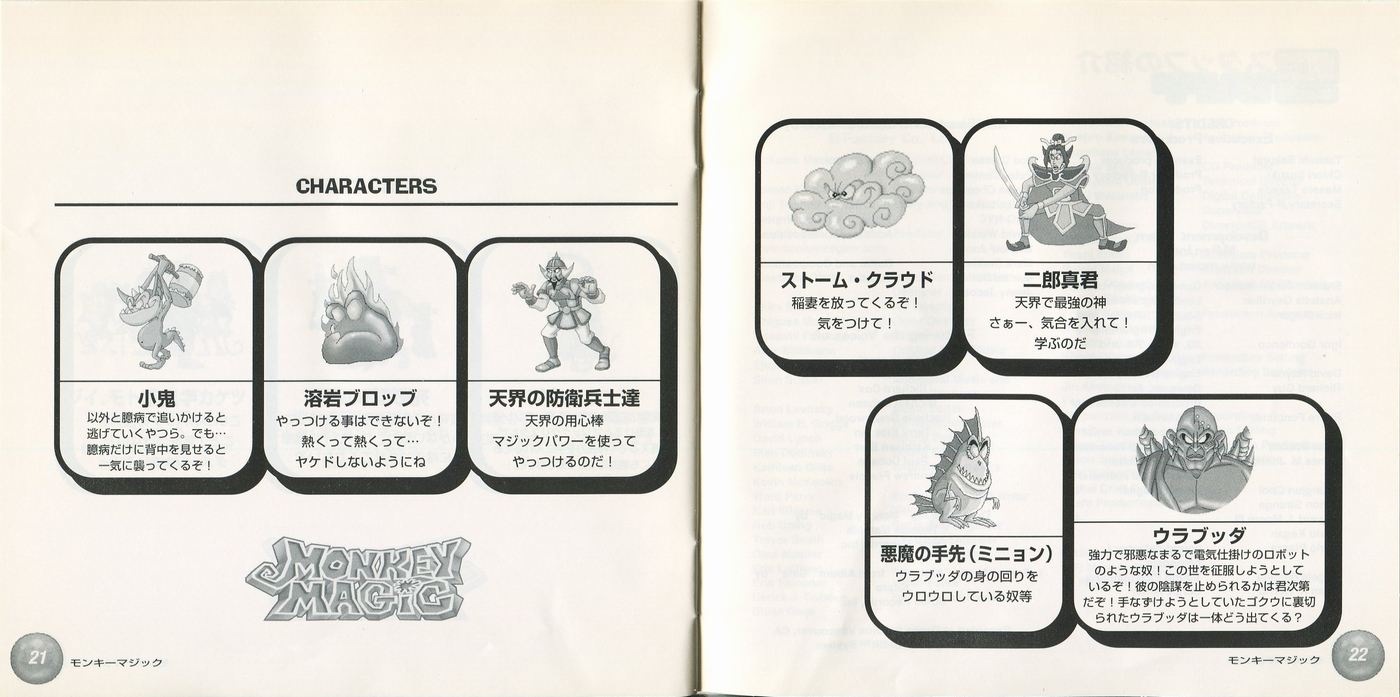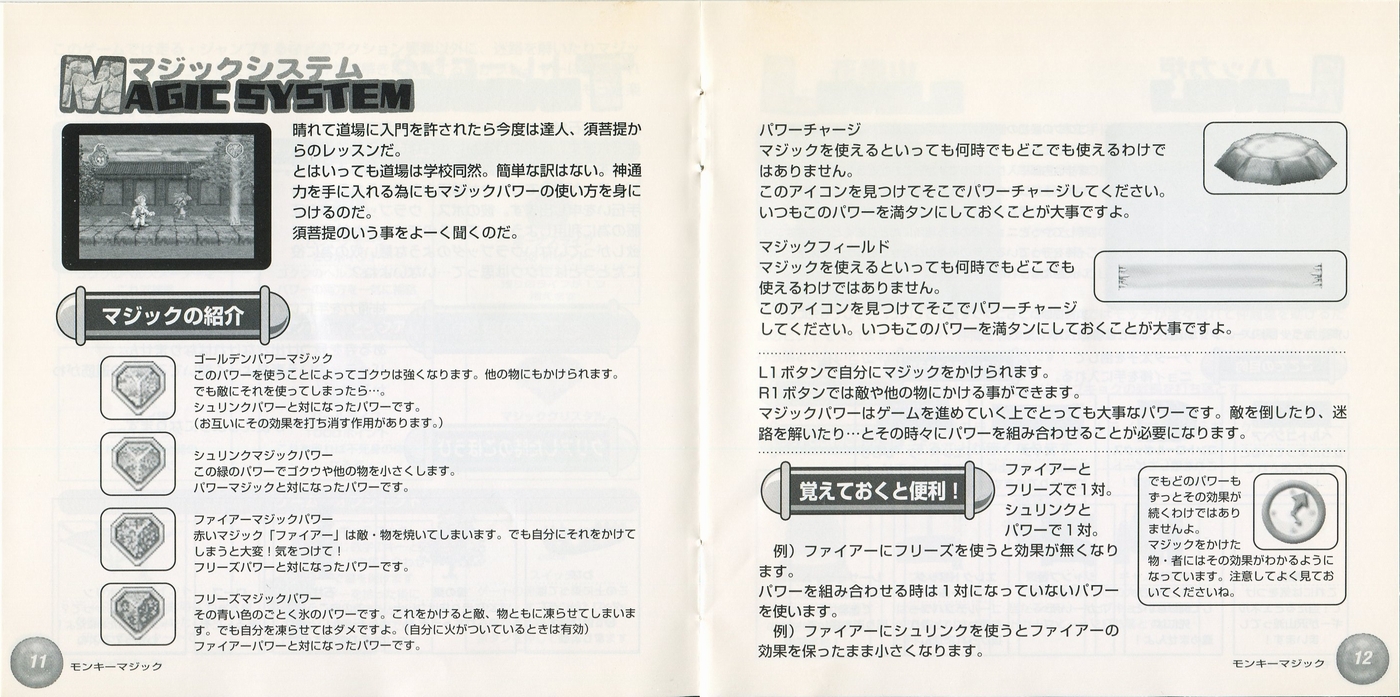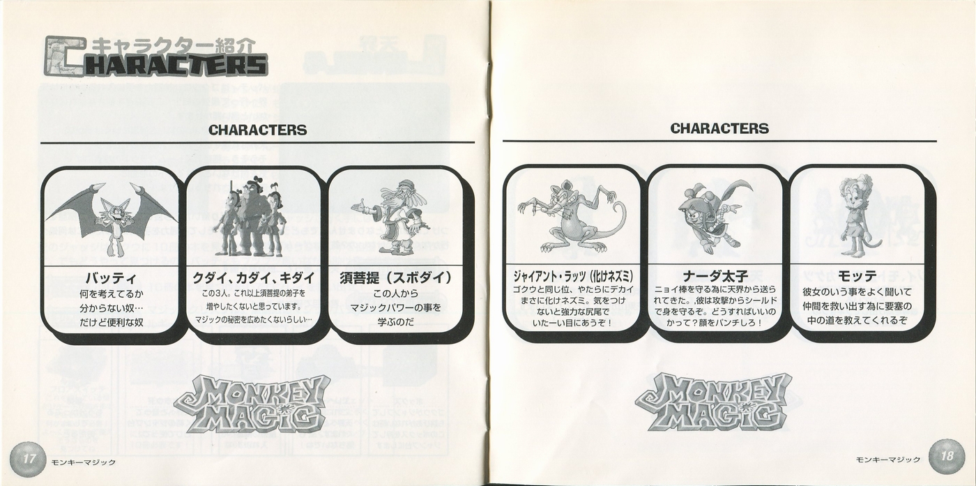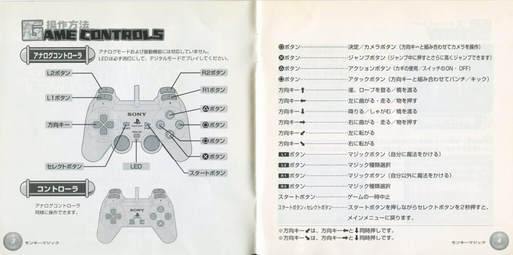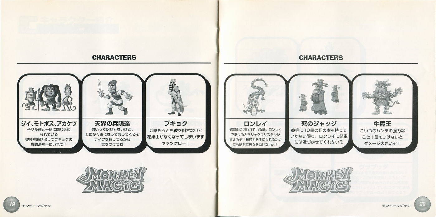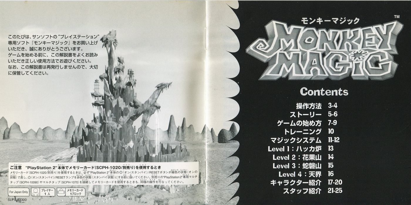 スポンサーリンク モンキーマジック[PS1] 2026.04.11 プレイステーション(PS1)ソフトモンキーマジックの説明書です(MONKEY MAGIC Instruction Manual)※スマホの画像操作は指2本で行ってください。 説明書画像(日本語)