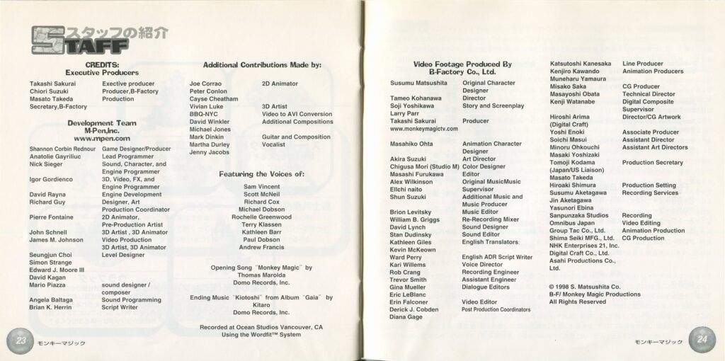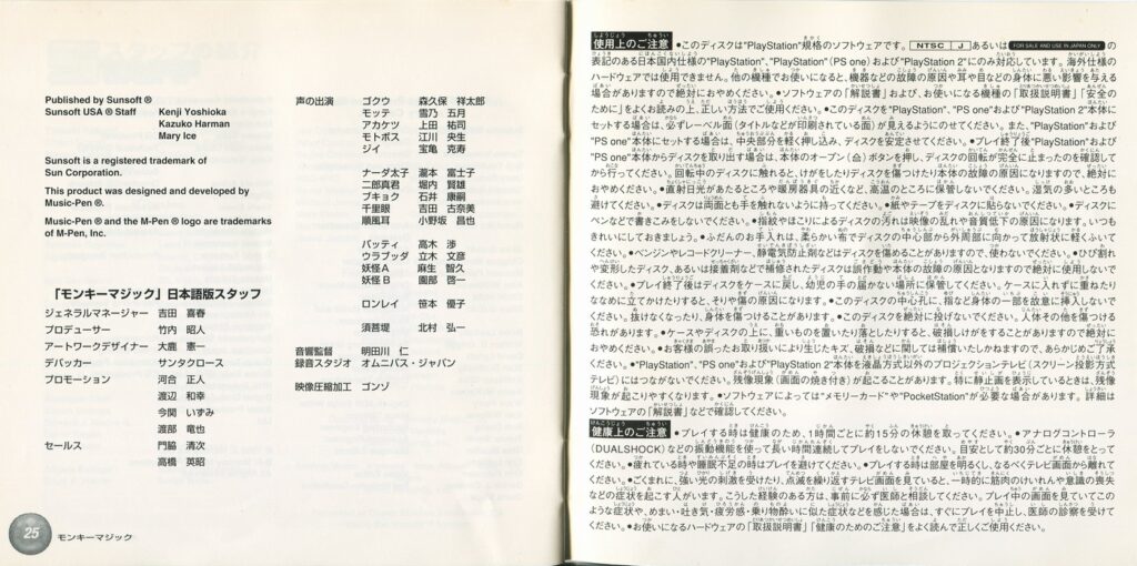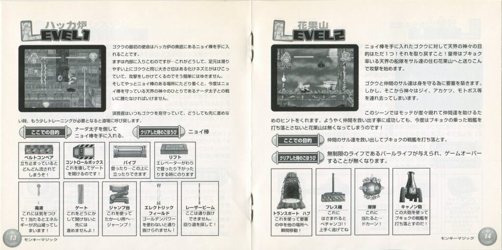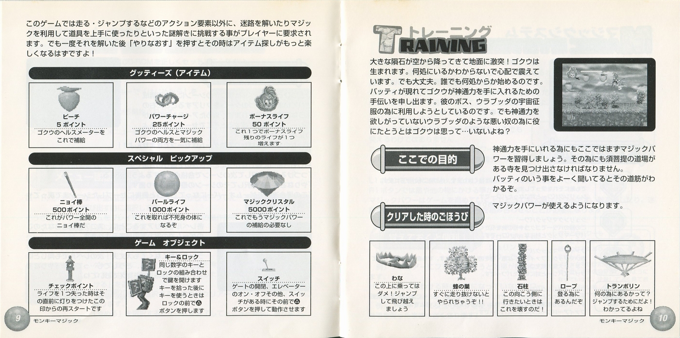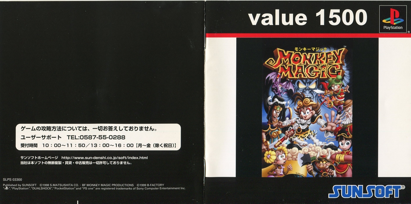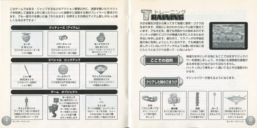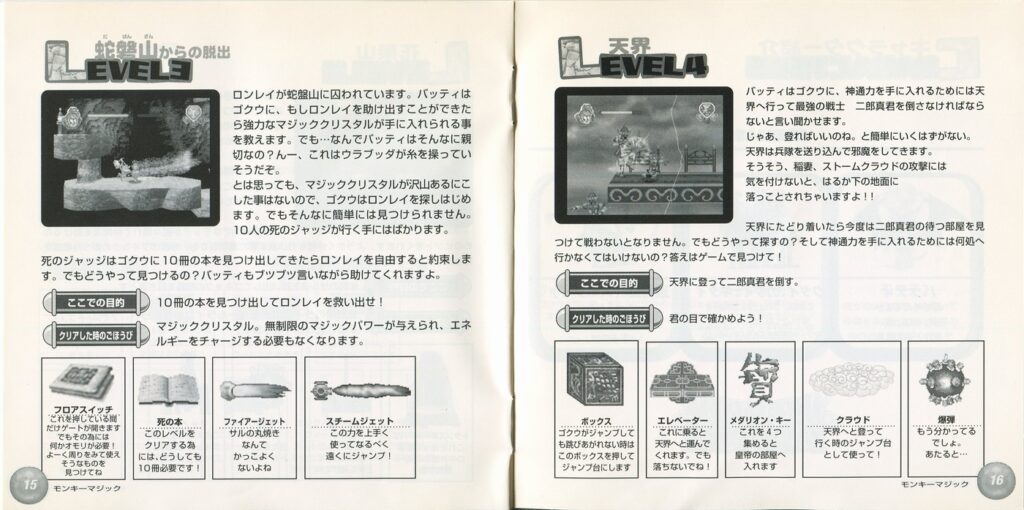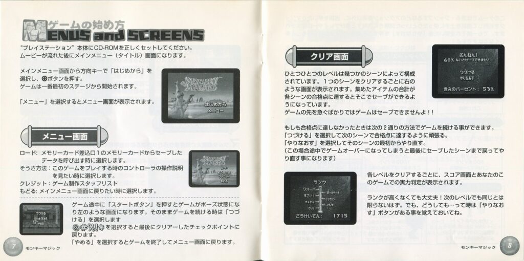 スポンサーリンク モンキーマジック[PS1] 2026.04.11 プレイステーション(PS1)ソフトモンキーマジックの説明書です(MONKEY MAGIC Instruction Manual)※スマホの画像操作は指2本で行ってください。 説明書画像(日本語)