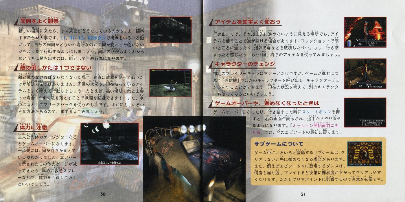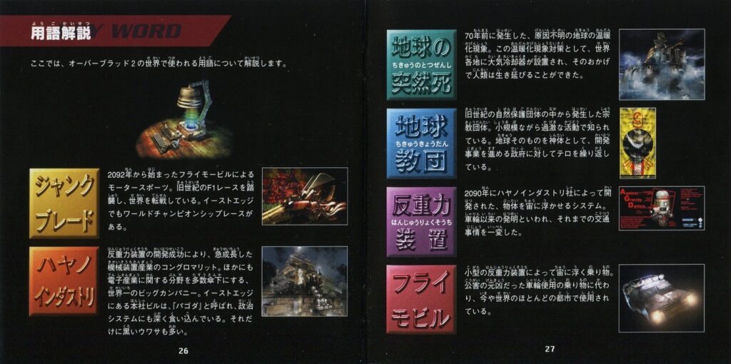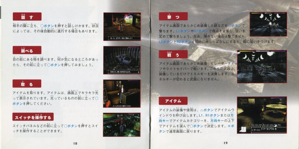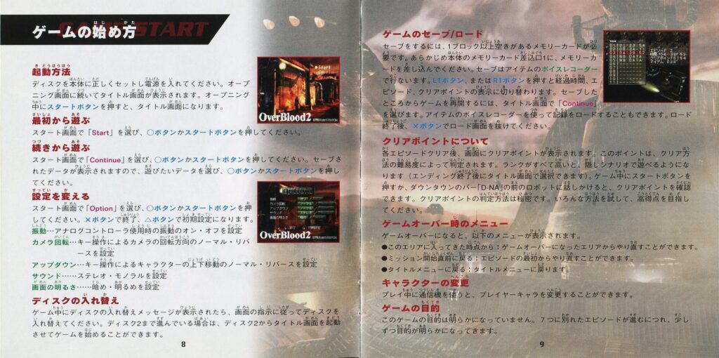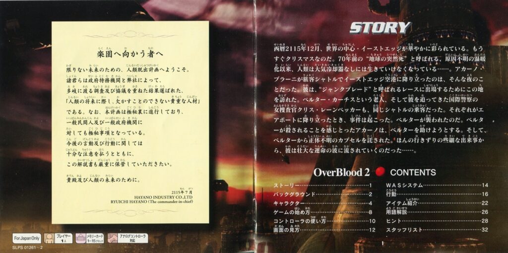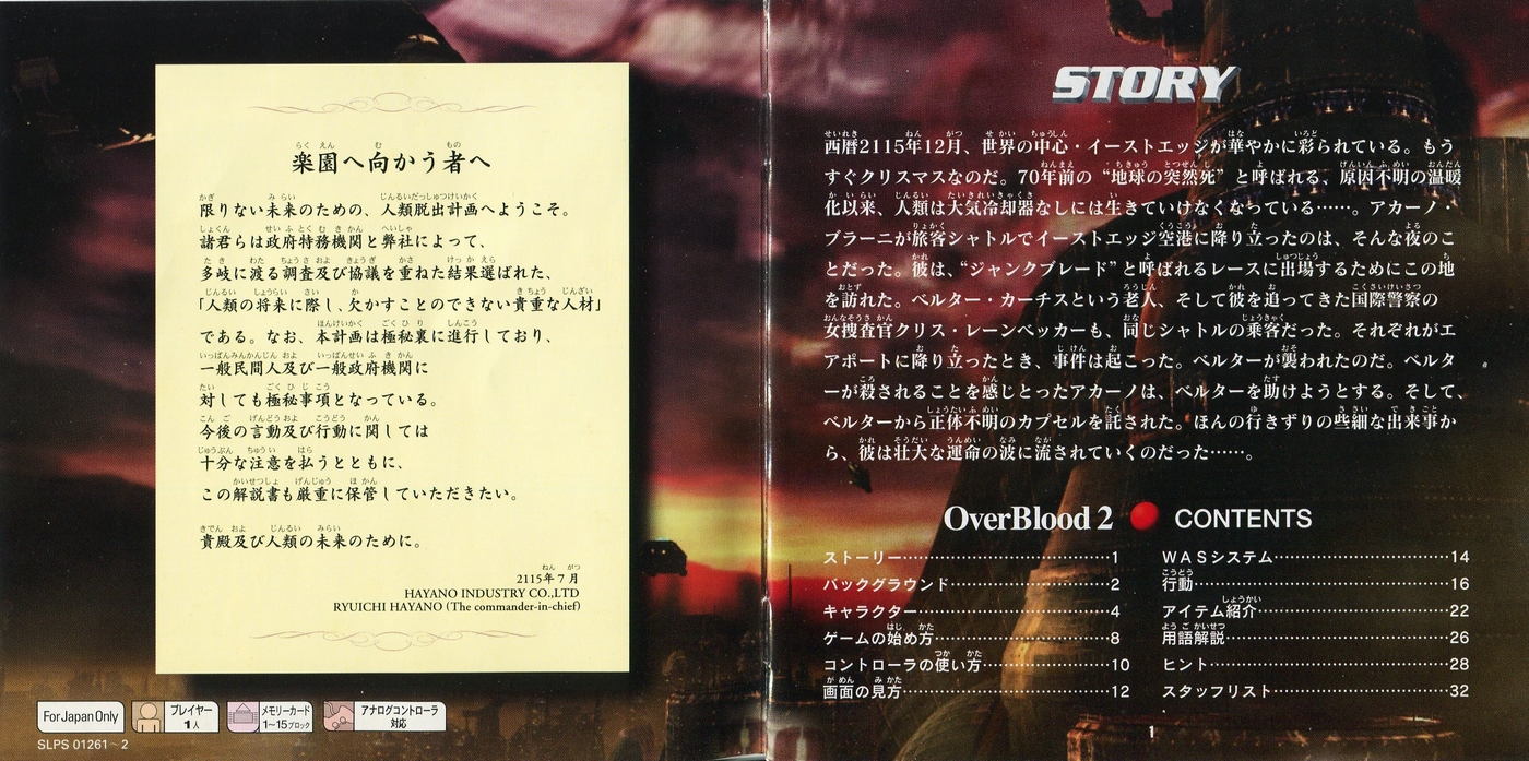 スポンサーリンク オーバーブラッド2 説明書 2025.10.11 プレイステーション(PS1)ソフトオーバーブラッド2の説明書です(OverBlood2 Instruction Manual)※スマホの画像操作は指2本で行ってください。 説明書画像(日本語)