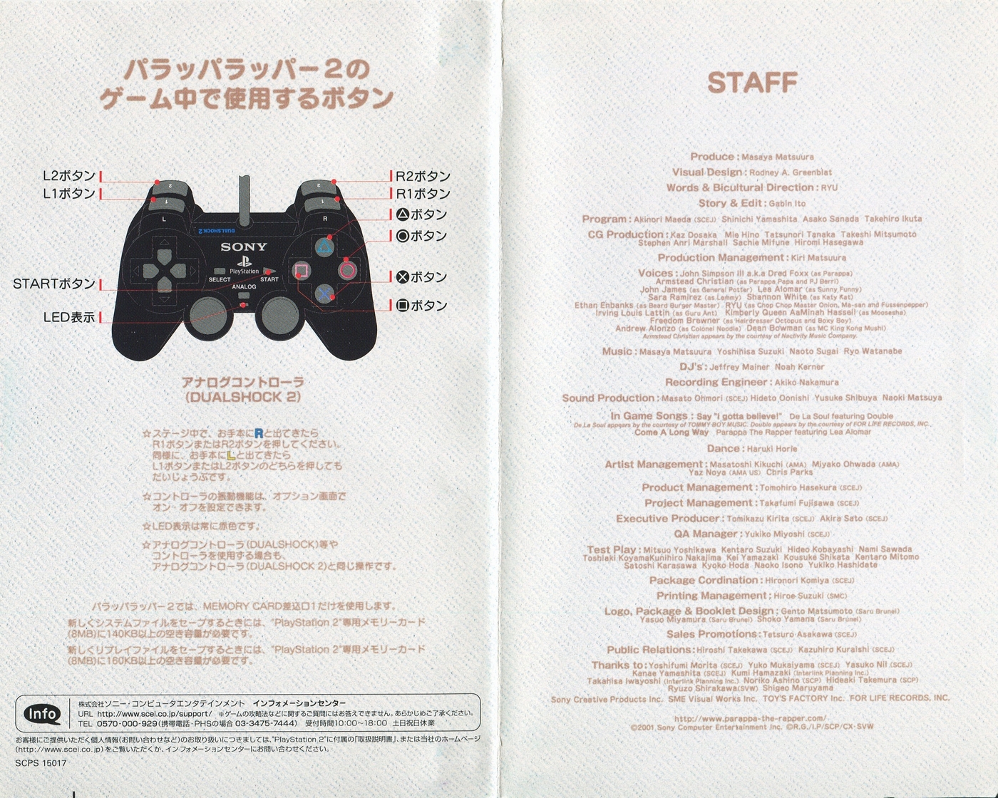スポンサーリンク パラッパラッパー2[PS2] 2026.04.11 プレイステーション2(PS2)ソフトパラッパラッパー2の説明書です(PaRappa The Rapper2 Instruction Manual)※スマホの画像操作は指2本で行ってください。 説明書画像(日本語)
