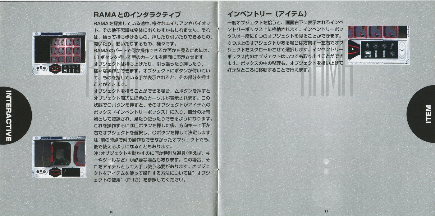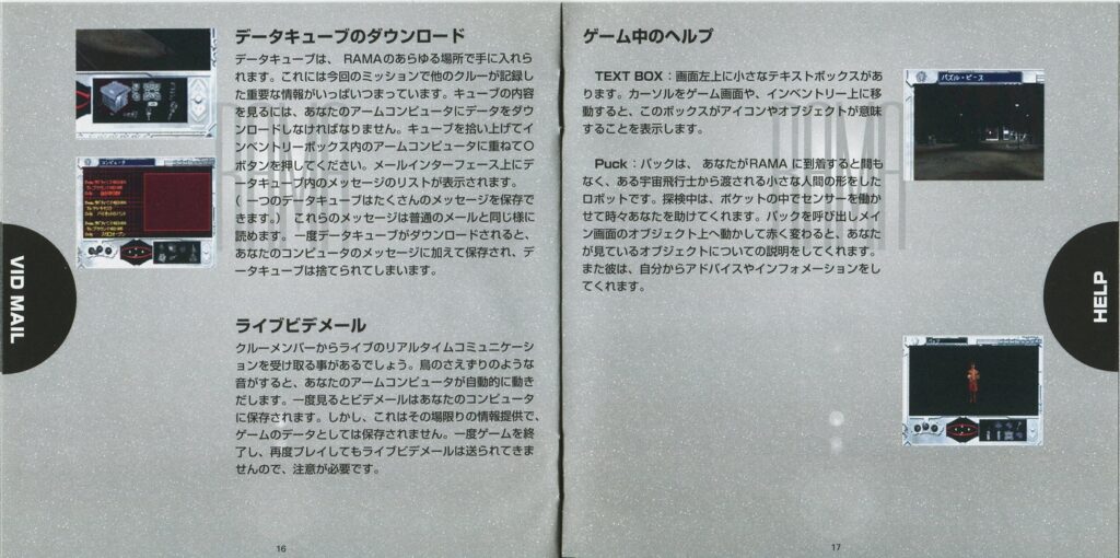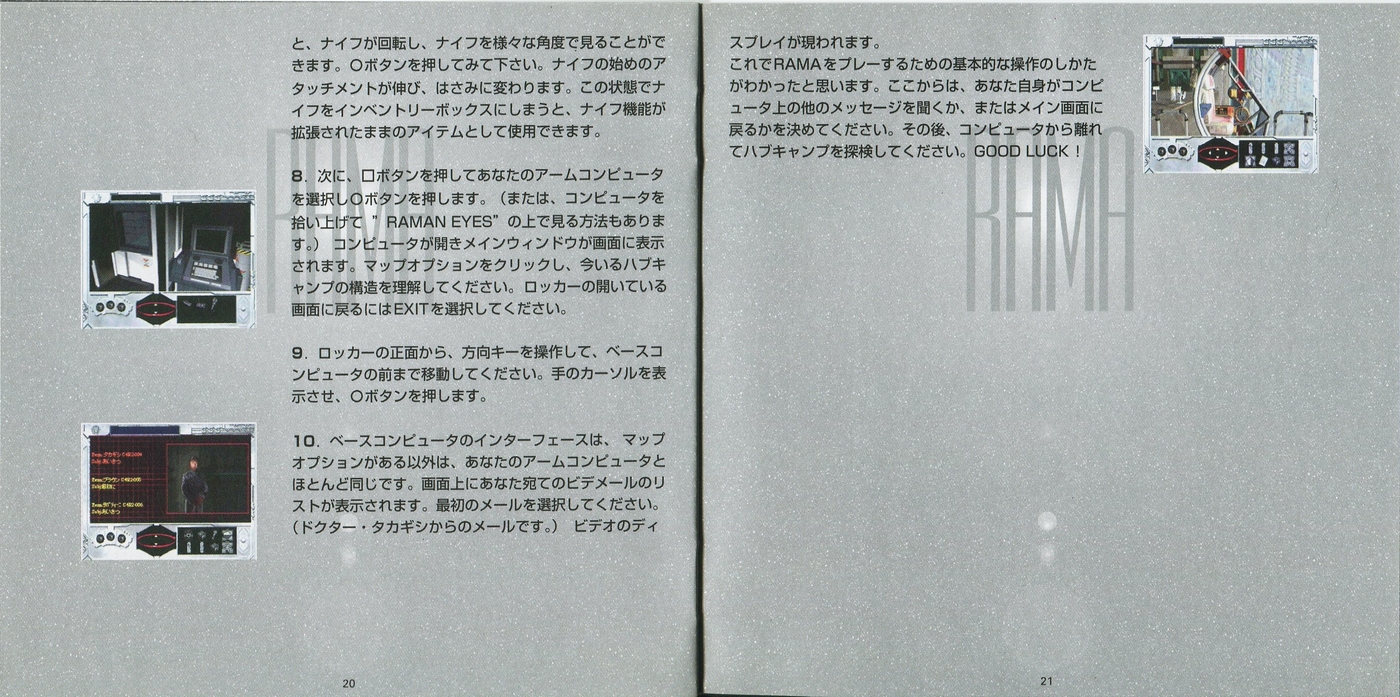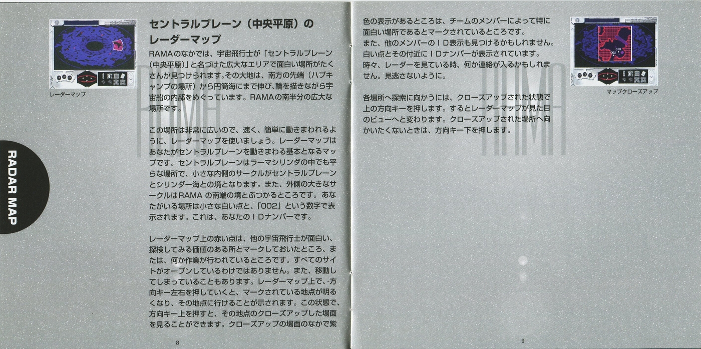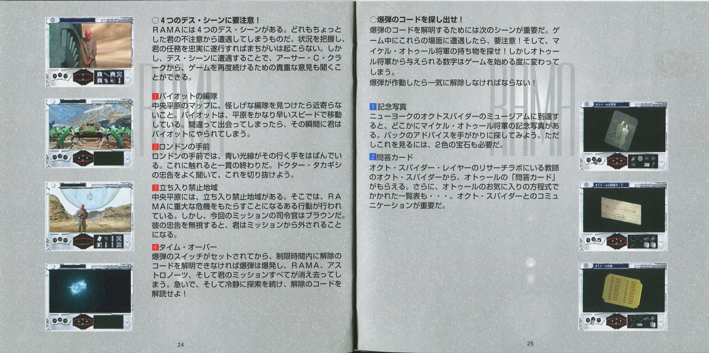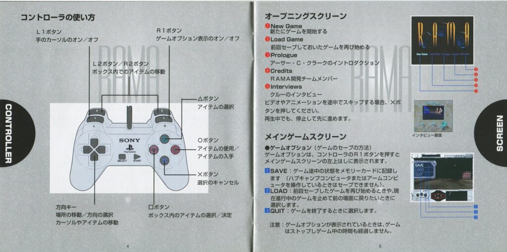 スポンサーリンク 宇宙のランデヴー ~RAMA~[PS1] 2026.01.06 プレイステーション(PS1)ソフト宇宙のランデヴー ~RAMA~の説明書です(RAMA Instruction Manual)※スマホの画像操作は指2本で行ってください。 説明書画像(日本語)
