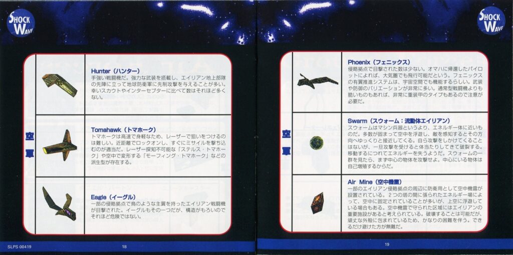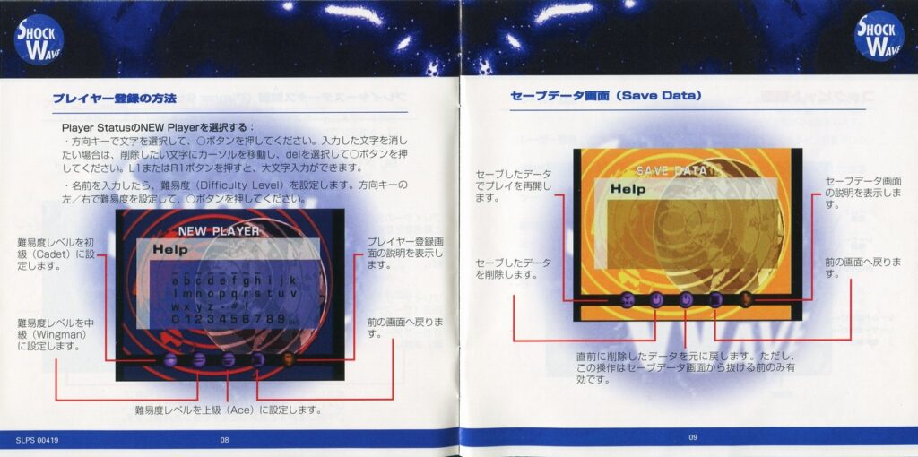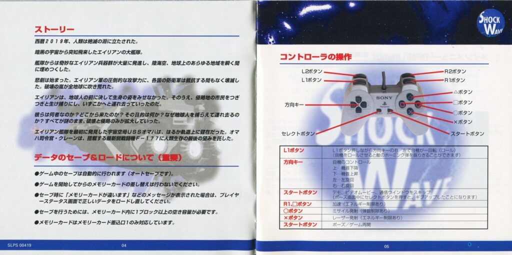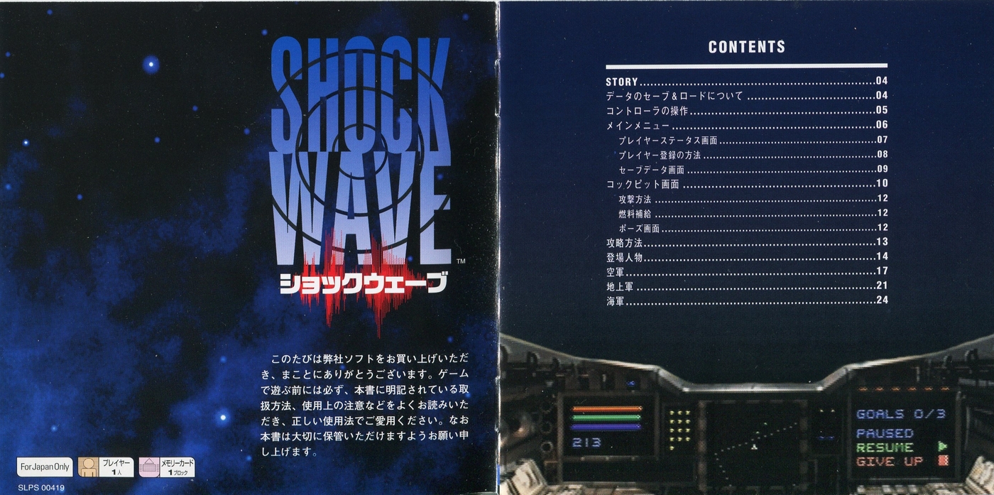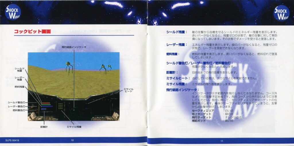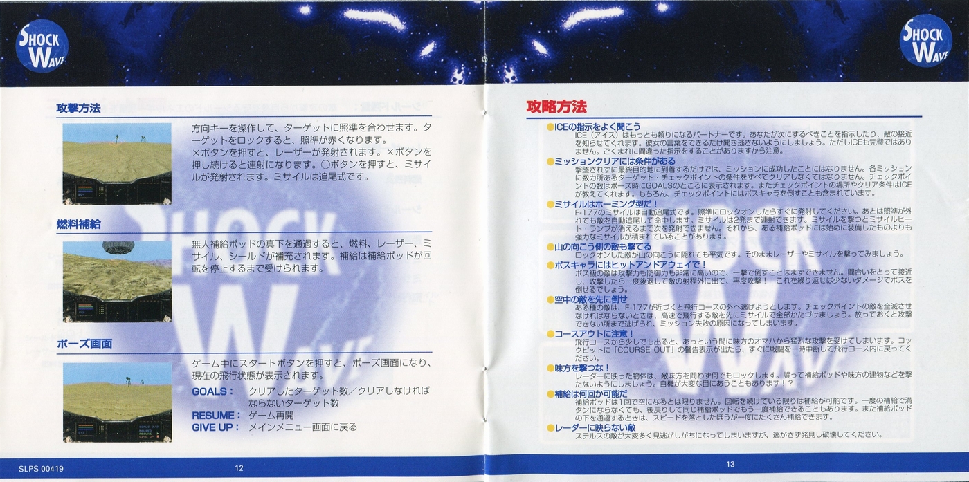 スポンサーリンク ショックウェーブ[PS1] 2026.01.05 プレイステーション(PS1)ソフトショックウェーブの説明書です(SHOCKWAVE Instruction Manual)※スマホの画像操作は指2本で行ってください。 説明書画像(日本語)