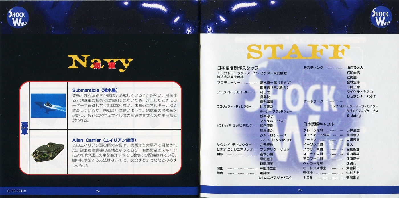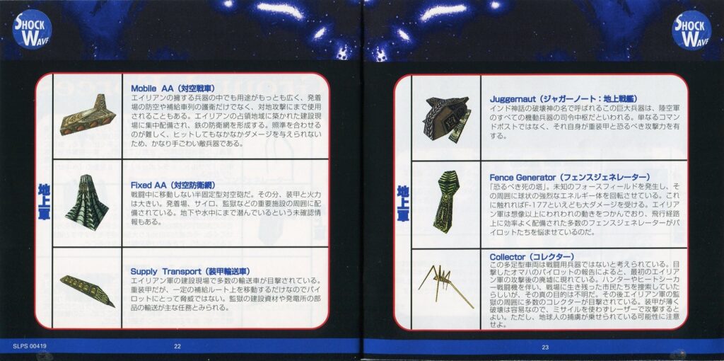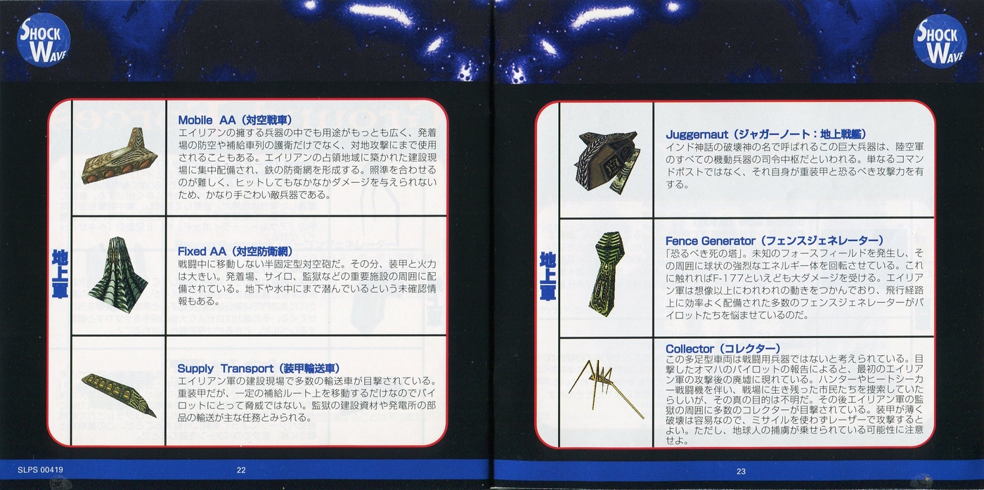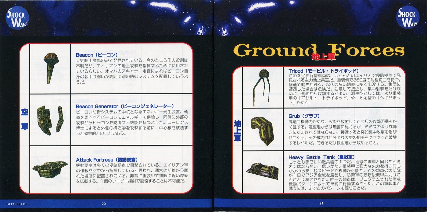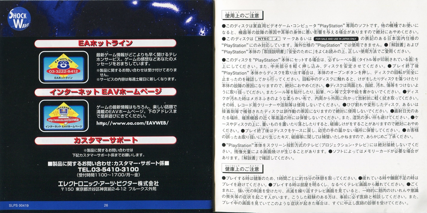 スポンサーリンク ショックウェーブ[PS1] 2026.01.05 プレイステーション(PS1)ソフトショックウェーブの説明書です(SHOCKWAVE Instruction Manual)※スマホの画像操作は指2本で行ってください。 説明書画像(日本語)