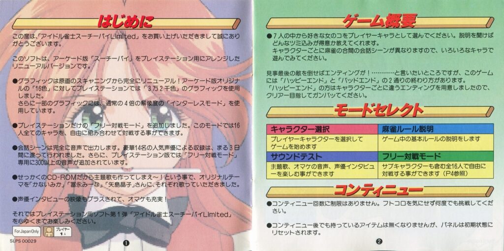 スポンサーリンク アイドル雀士 スーチーパイ リミテッド[PS1] 2026.03.28 プレイステーション(PS1)ソフトアイドル雀士 スーチーパイ リミテッドの説明書です(IDOL JANSHI SUCHIE-PAI Limited Instruction Manual)※スマホの画像操作は指2本で行ってください。 説明書画像(日本語)