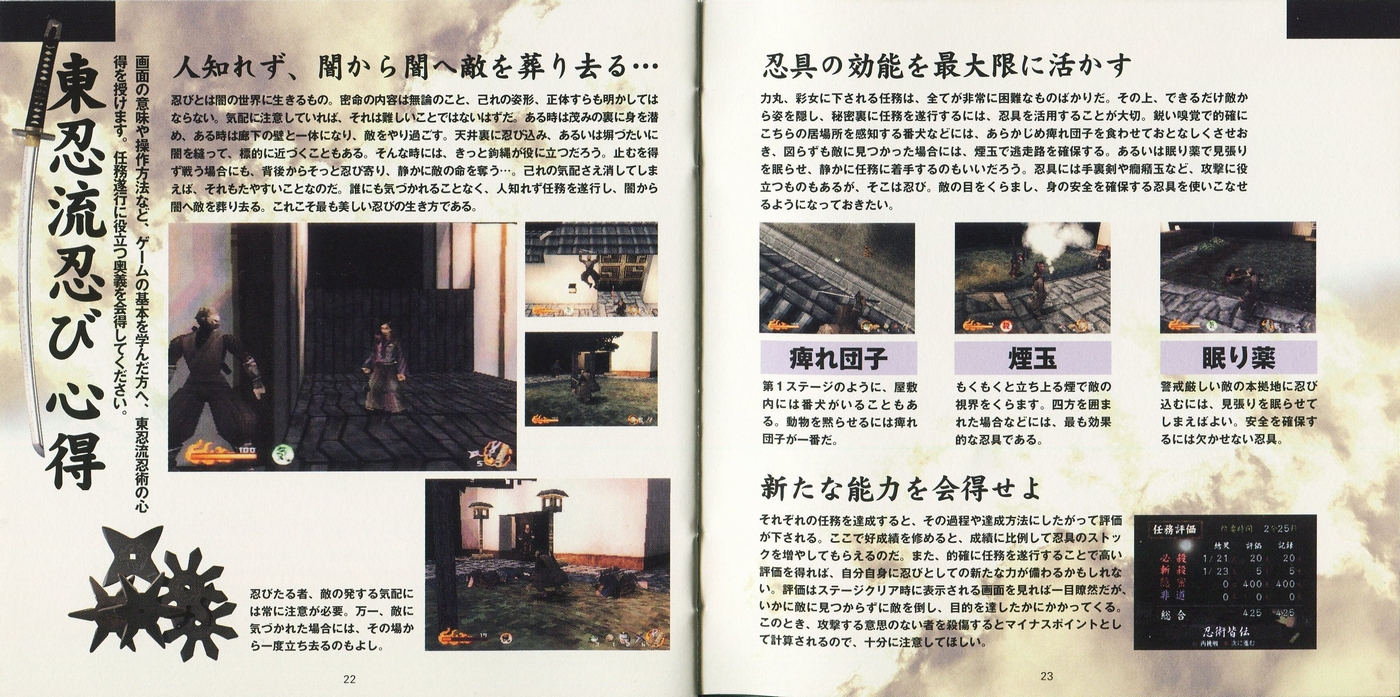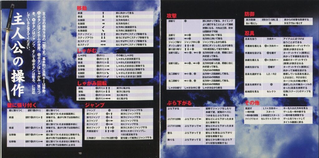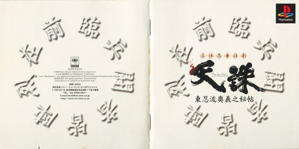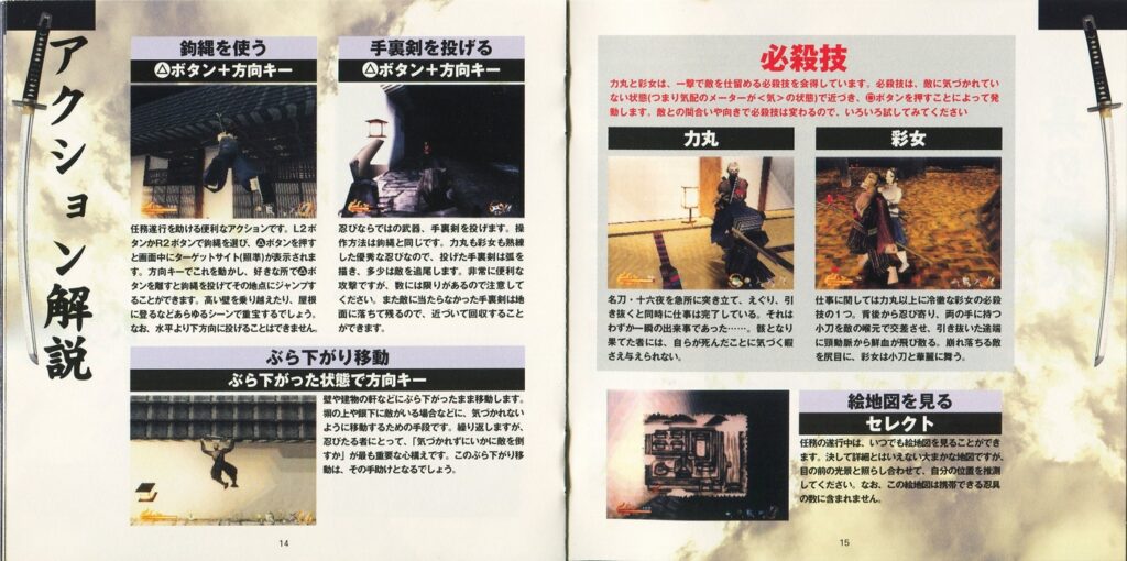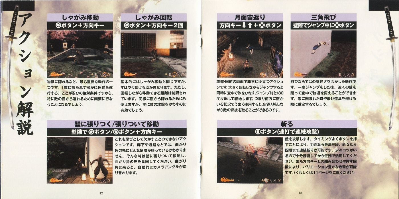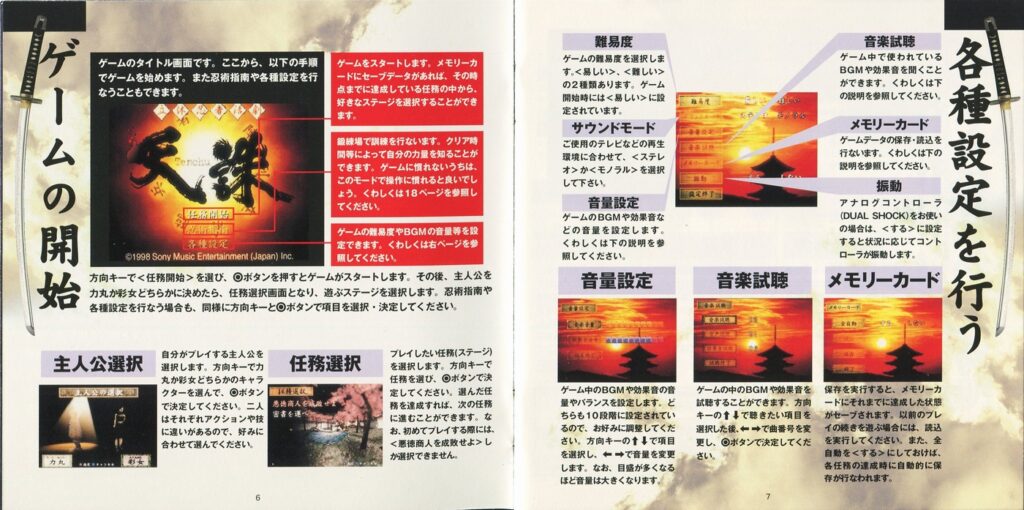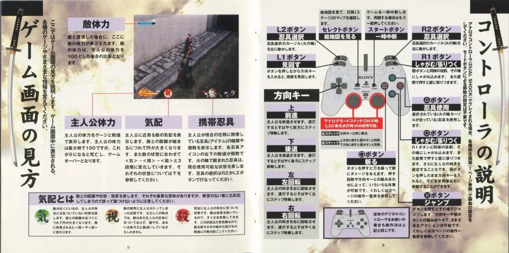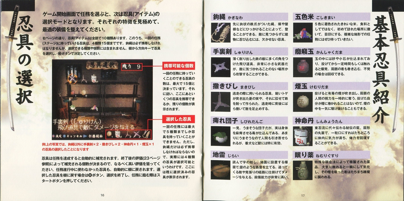 スポンサーリンク 天誅 説明書 2025.10.24 プレイステーション(PS1)ソフト立体忍者活劇 天誅の説明書です(TENCHU Instruction Manual)※スマホの画像操作は指2本で行ってください。 説明書画像(日本語)