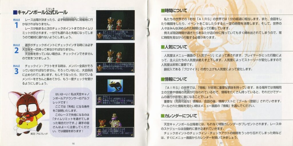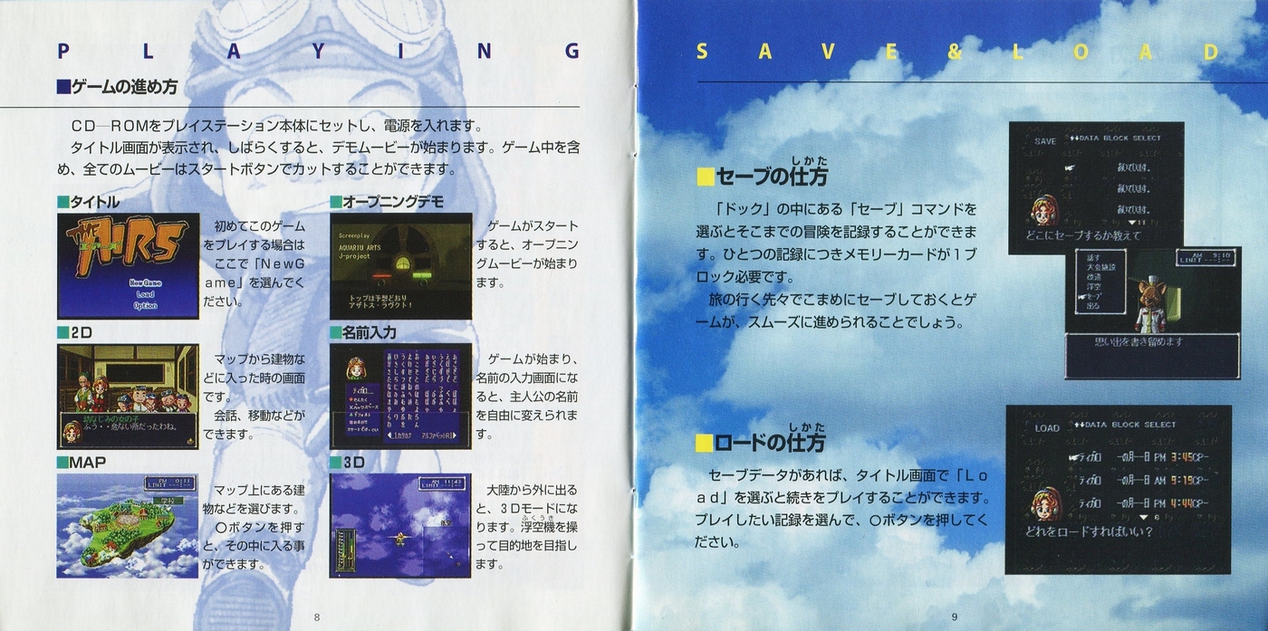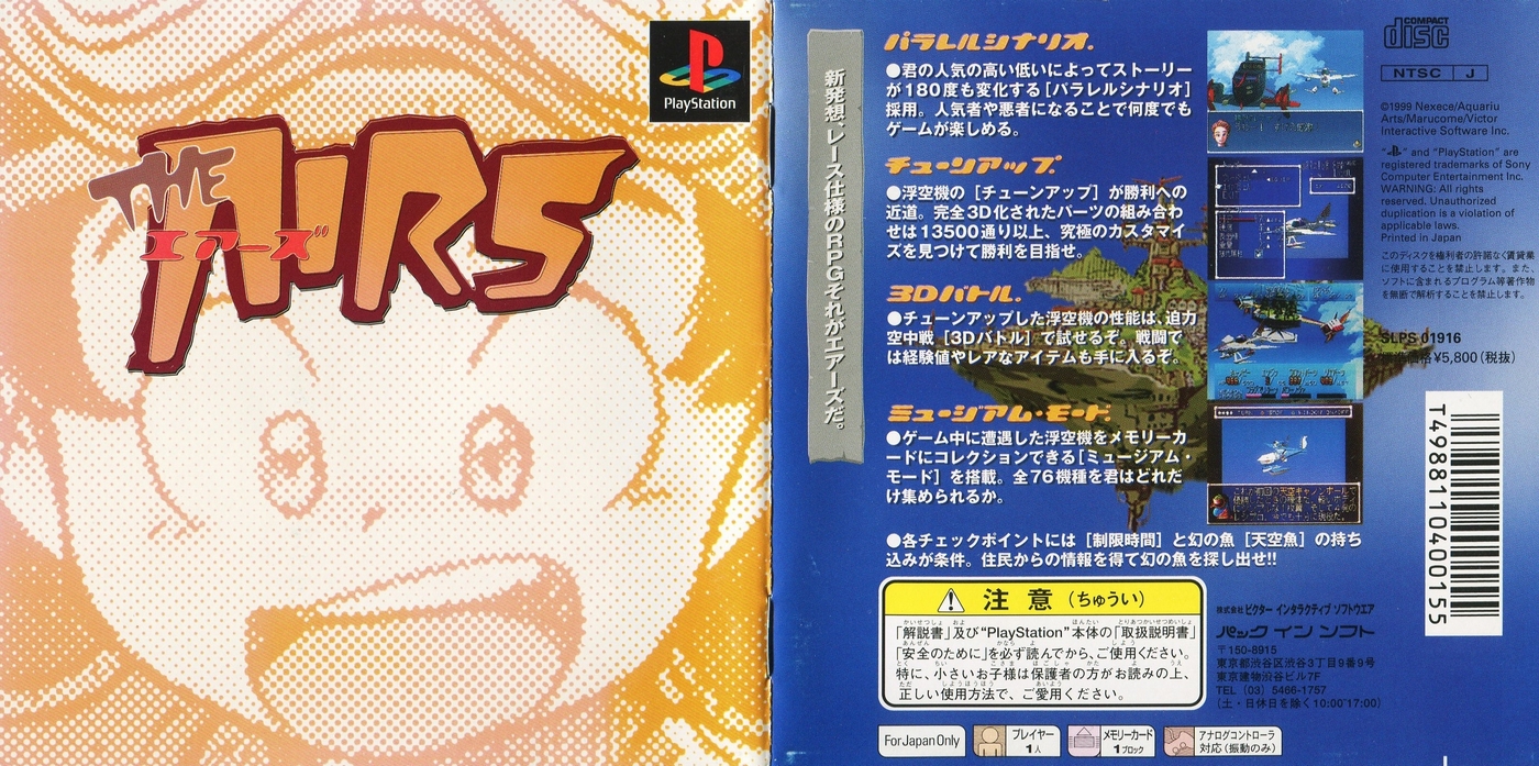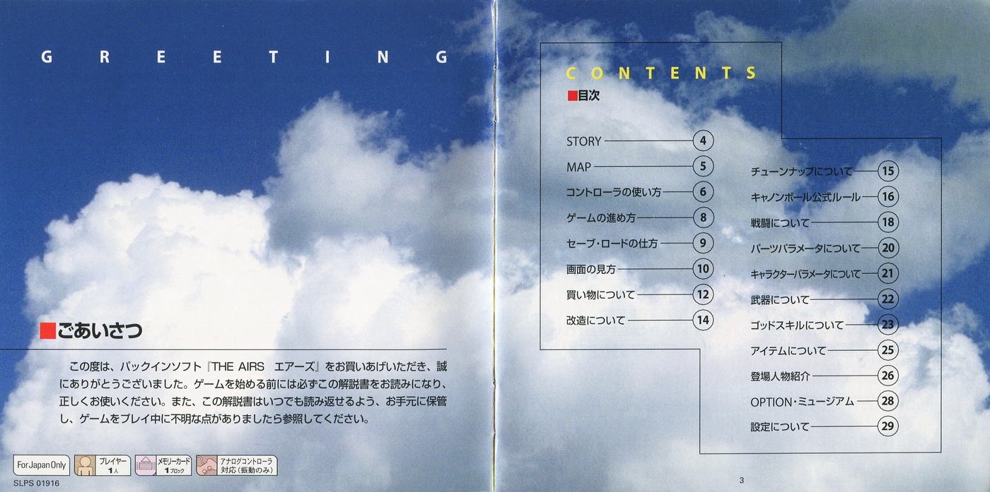 スポンサーリンク エアーズ 説明書 2025.11.29 プレイステーション(PS1)ソフトエアーズの説明書です(THE AIRS Instruction Manual)※スマホの画像操作は指2本で行ってください。 説明書画像(日本語)