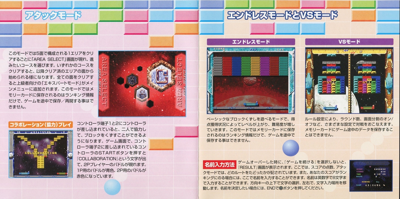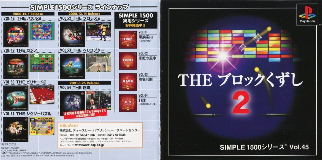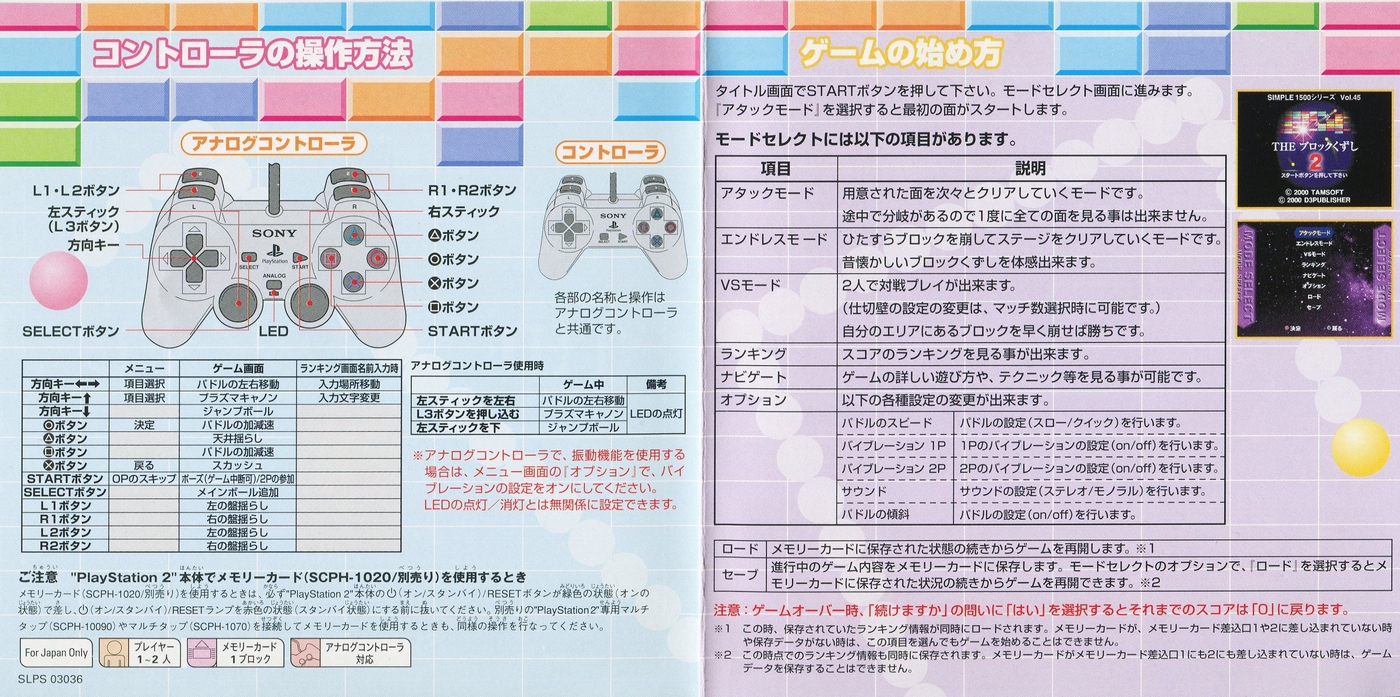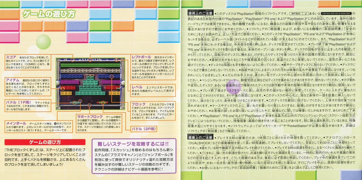 スポンサーリンク THE ブロックくずし2 説明書 2025.12.07 プレイステーション(PS1)ソフトTHE ブロックくずし2の説明書です(THE Block Kuzushi2 Instruction Manual)※スマホの画像操作は指2本で行ってください。 説明書画像(日本語)
