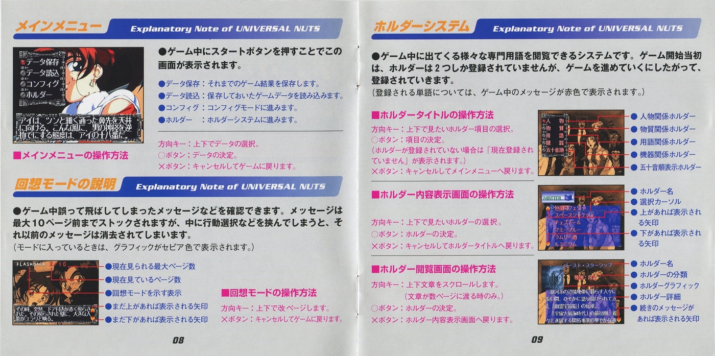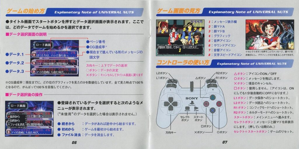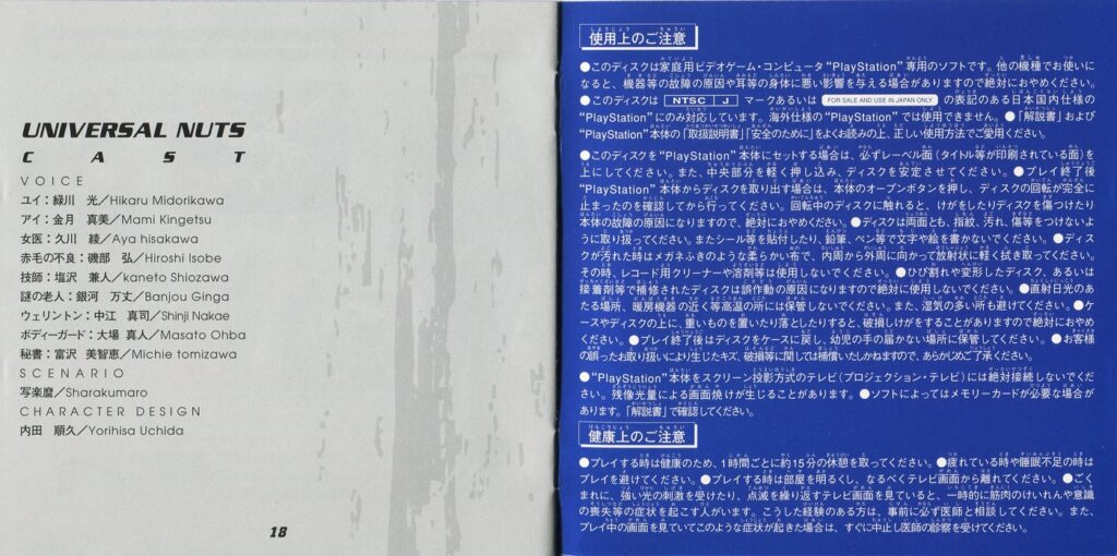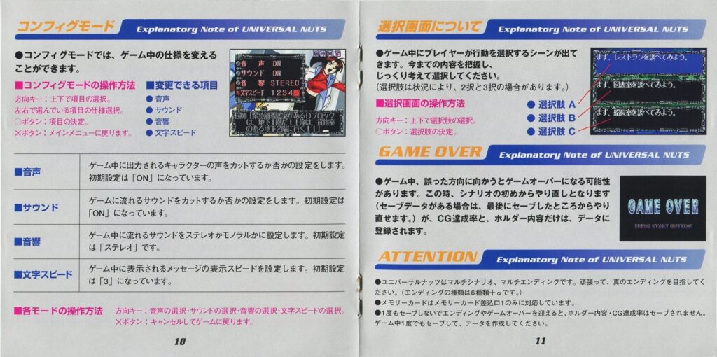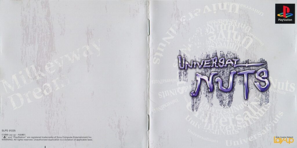 スポンサーリンク ユニバーサルナッツ[PS1] 2026.02.25 プレイステーション(PS1)ソフトユニバーサルナッツの説明書です(UNIVERSAL NUTS Instruction Manual)※スマホの画像操作は指2本で行ってください。 説明書画像(日本語)