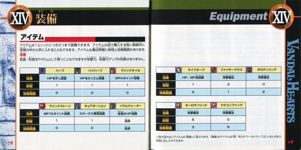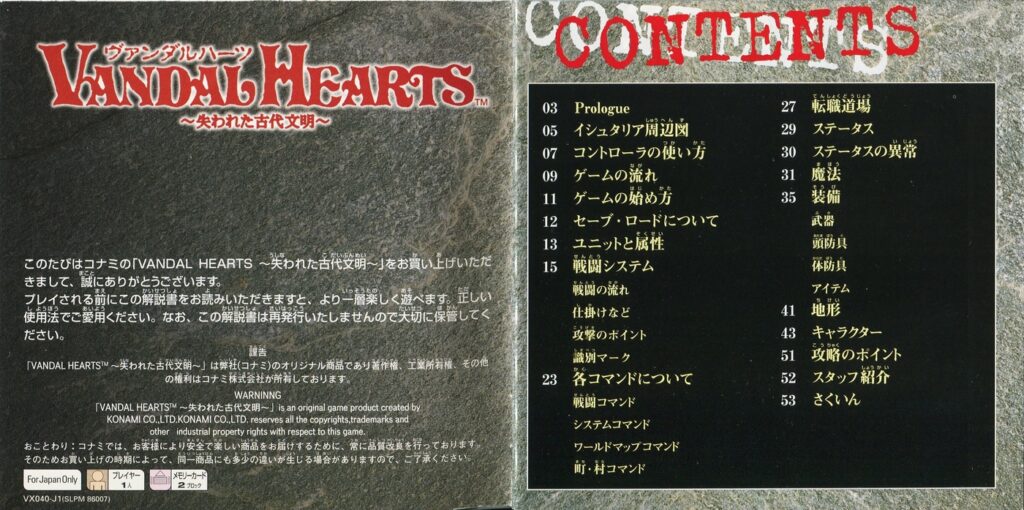 スポンサーリンク ヴァンダルハーツ 説明書 2025.10.11 プレイステーション(PS1)ソフトヴァンダルハーツの説明書です(VANDALHEARTS Instruction Manual)※スマホの画像操作は指2本で行ってください。 説明書画像(日本語)
